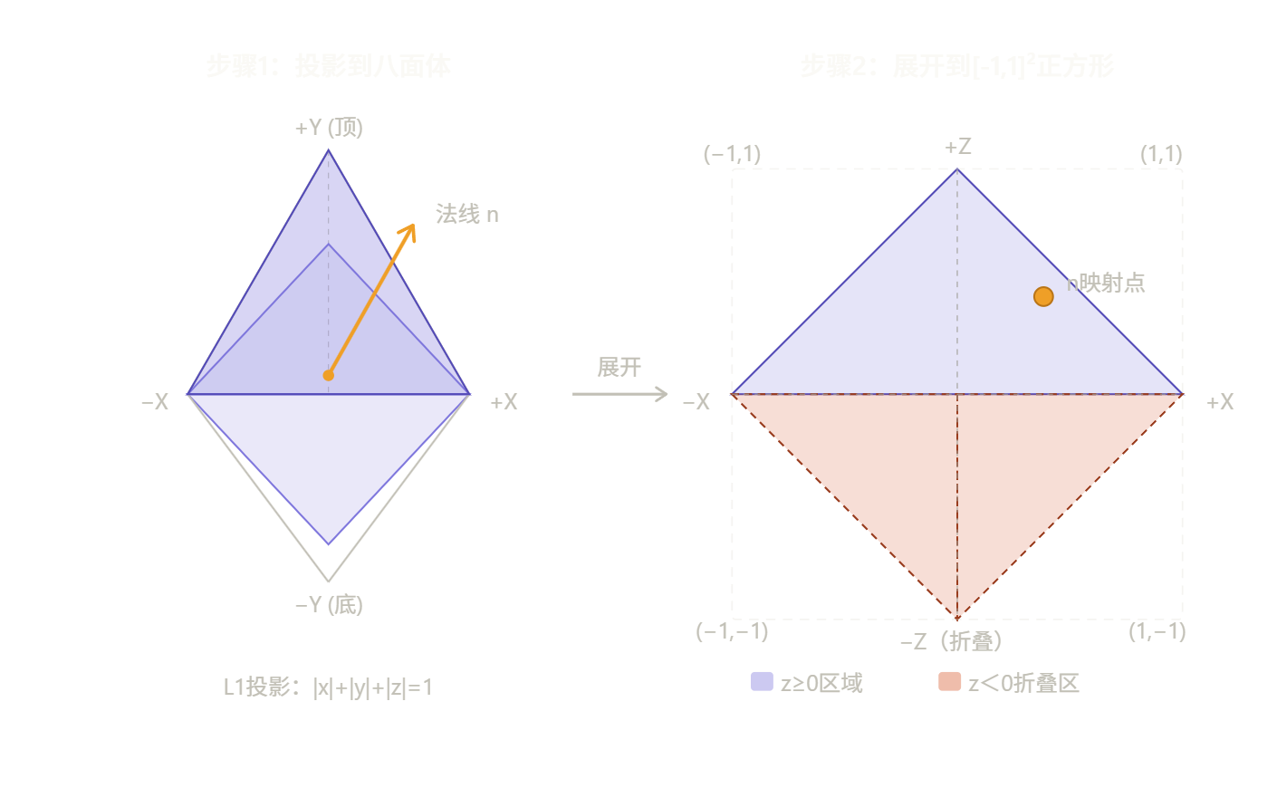 对于模型的法线向量来说,归一化后它的范围就是一个球范围,那么如果要映射到八面体上,就可以让X和Y分量除以L1范数