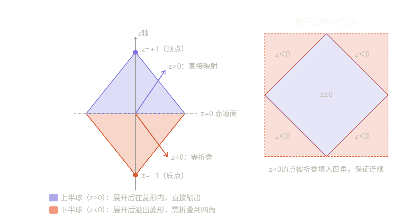 对于Z分量,则是另有用途,前面说过八面体上下是重叠,这里就需要使用Z分量进行处理,如果是在下方,那么X分量和Y分量则需要反转或者说折叠