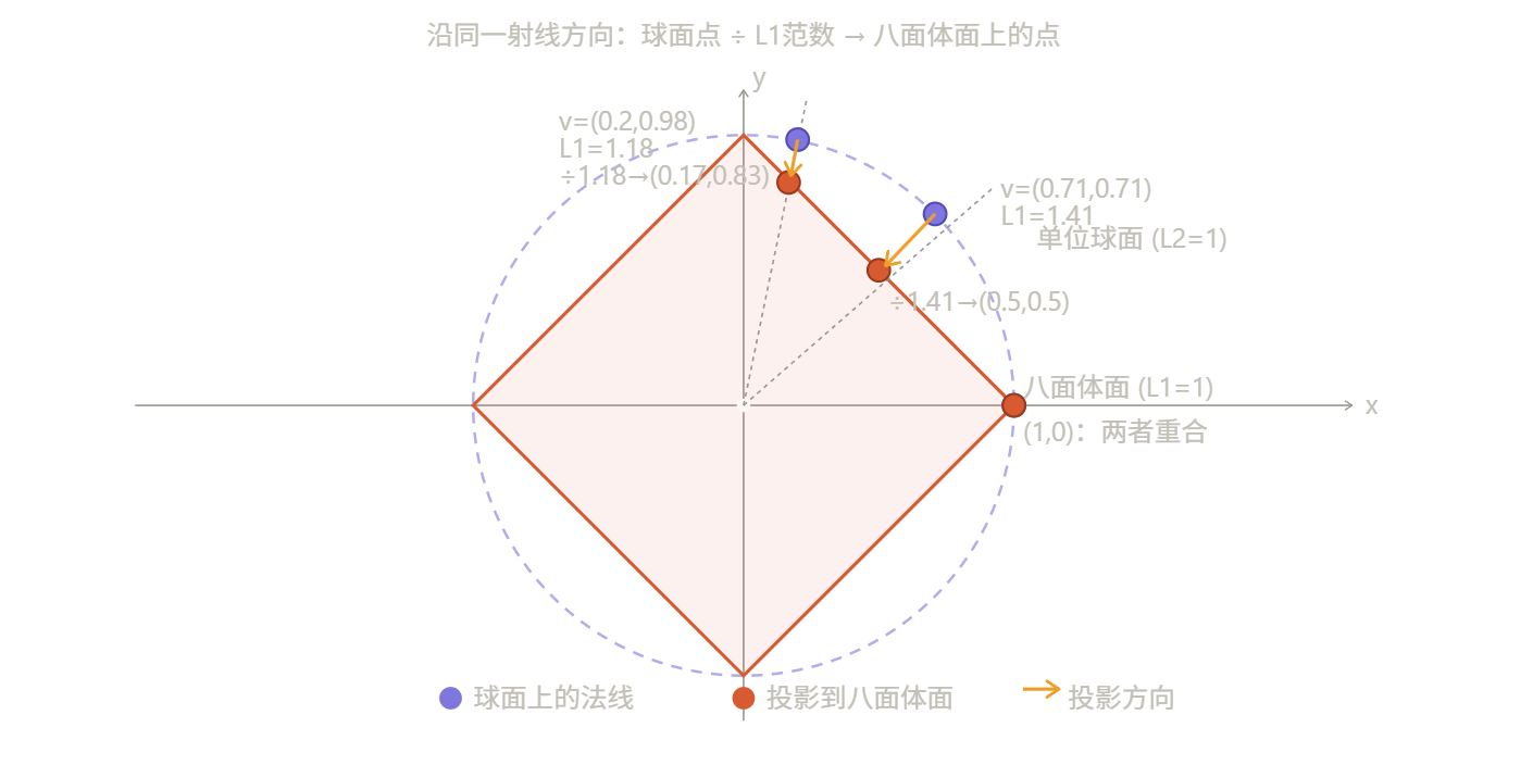 # 步骤2:通过除以L1范数进行投影到八面体表面