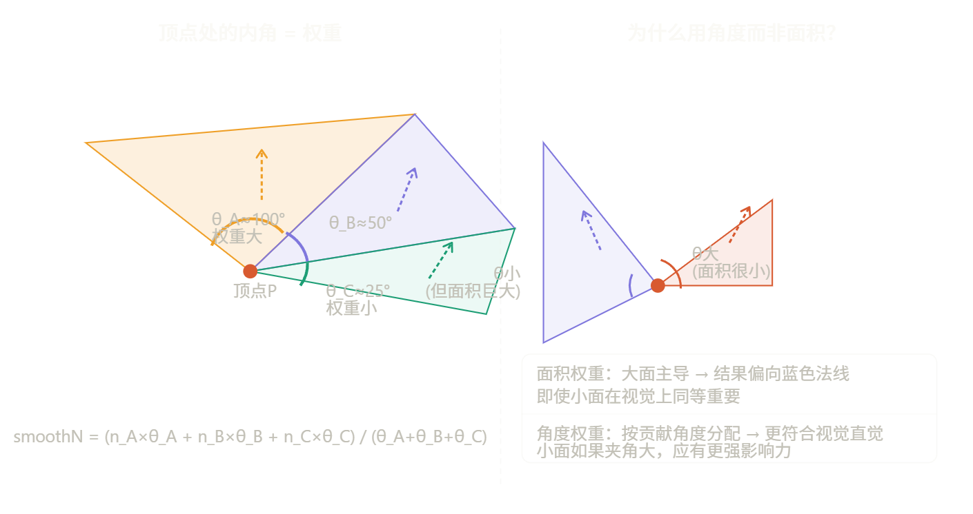 可以理解为对法线进行权重影响,这个权重来自于角度,一个顶点的法线,由周边的所有三角形法线和经过角度加权之后得到
