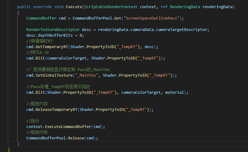 Execute(ScriptableRenderContext context, ref RenderingData renderingData)— 每帧到了指定的renderPassEvent时机就跑。在这里写CommandBuffer,发真正的GPU渲染指令。