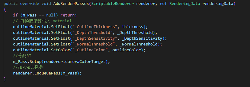 AddRenderPasses(ScriptableRenderer renderer, ref RenderingData renderingData)— 注册。每帧跑一次。在这里把Pass加入渲染队列,顺便把当帧参数传给Pass。不做初始化,不发GPU指令。