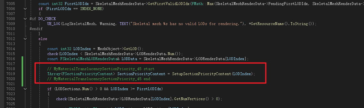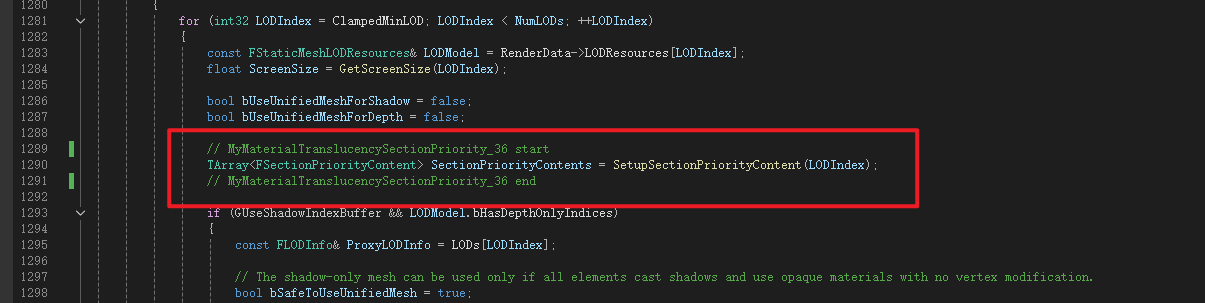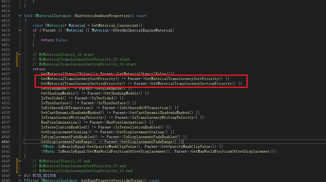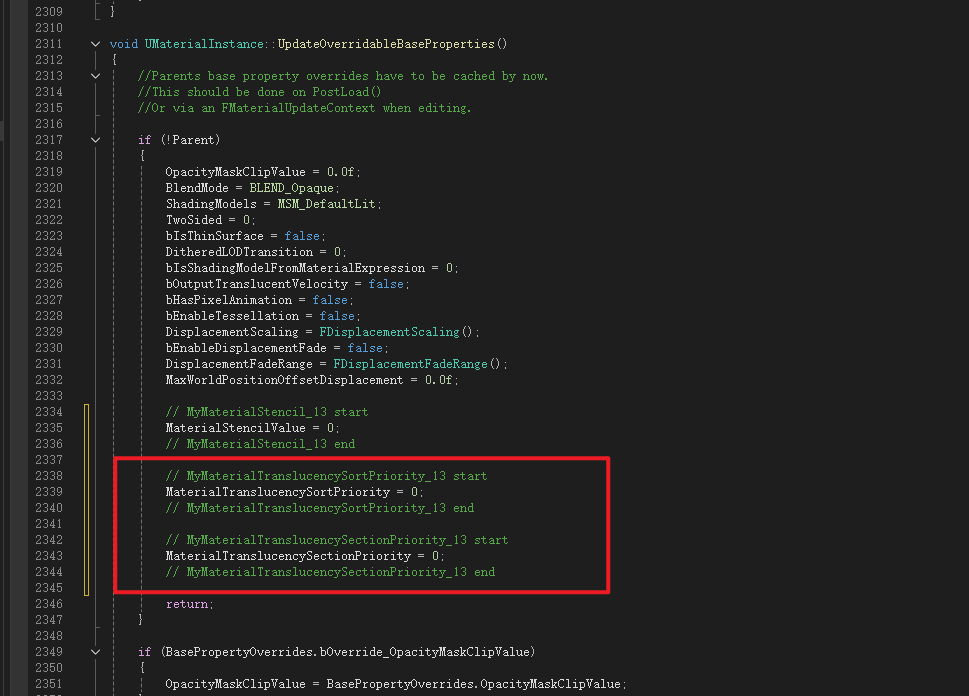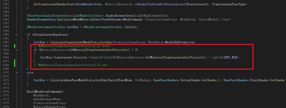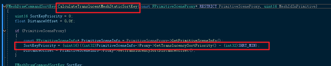如果想简单实现半透明排序MaterialTranslucencySortPriority,那么在这里直接将默认的排序覆盖掉就行,也可以整合到CalculateTranslucentMeshStaticSortKey中去设置。找到对应计算半透明排序的位置,直接用材质上的排序给他覆盖掉就行