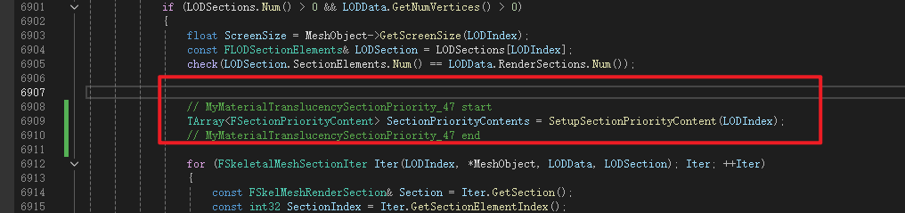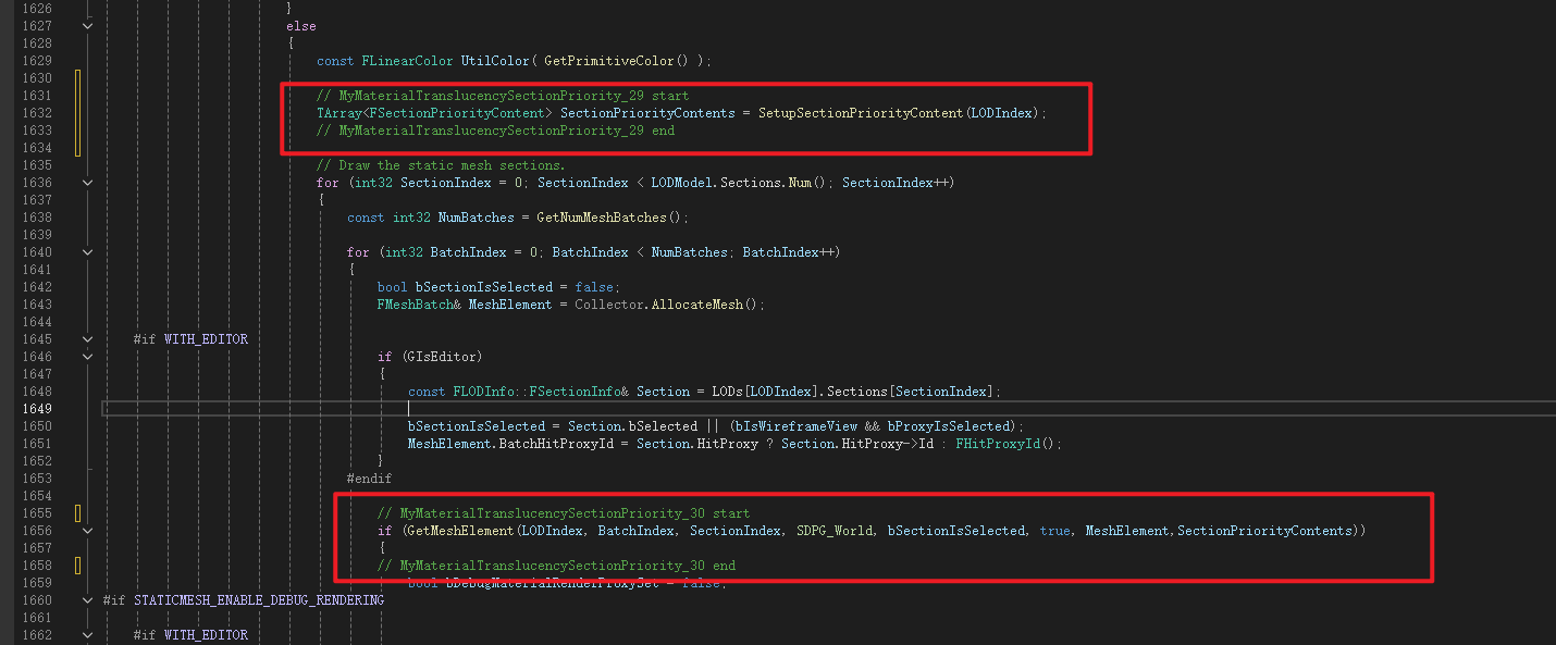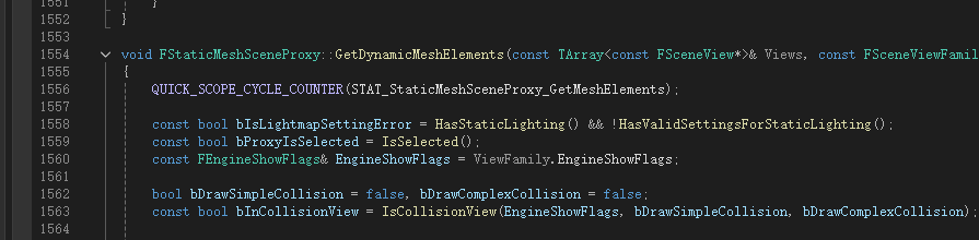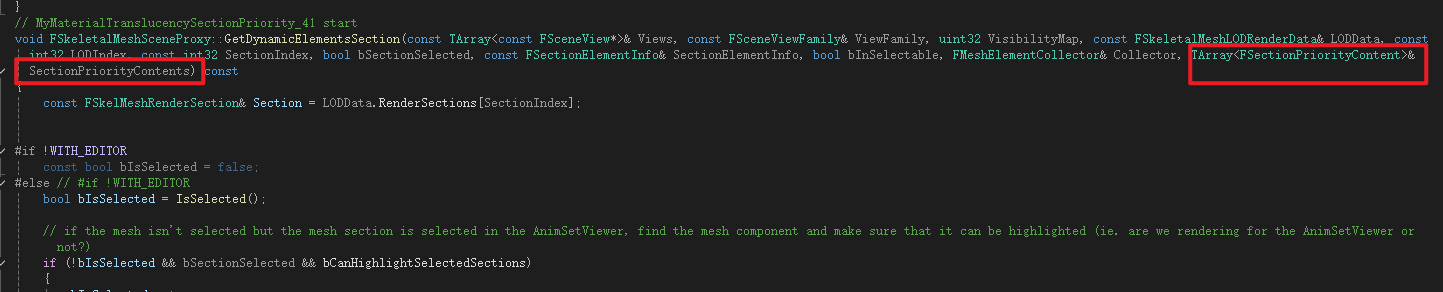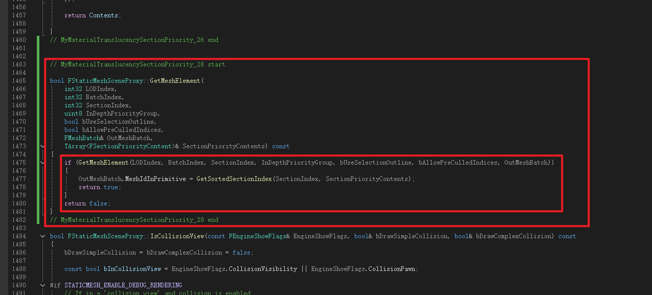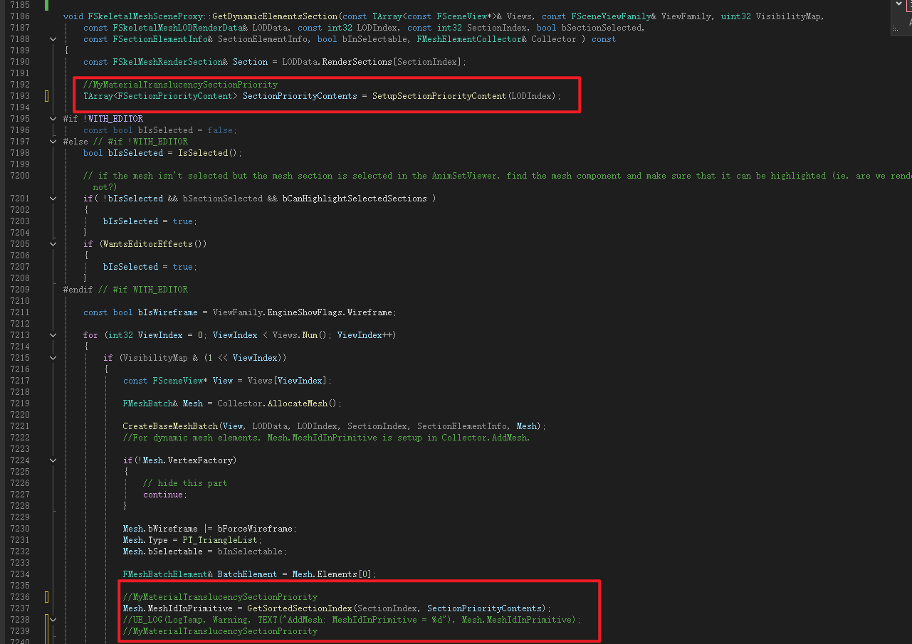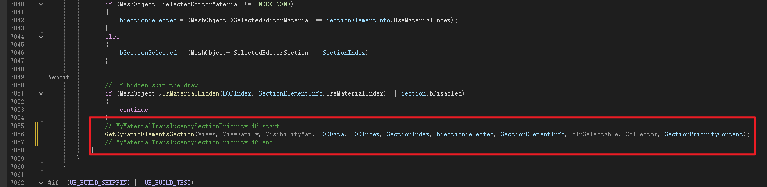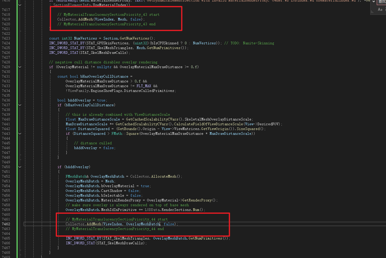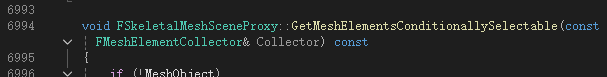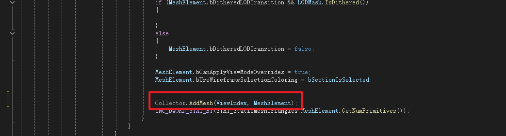 流程和静态网格体其实差不多,先找到Collector.AddMesh在哪里调用,最终可以定位到GetDynamicElementsSection函数,如果想简单的修改,那么直接像下图一样修改原函数就行,直接赋值,然后更改Collector.AddMesh就行。我测试过是没有问题的