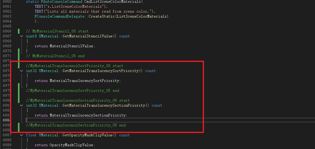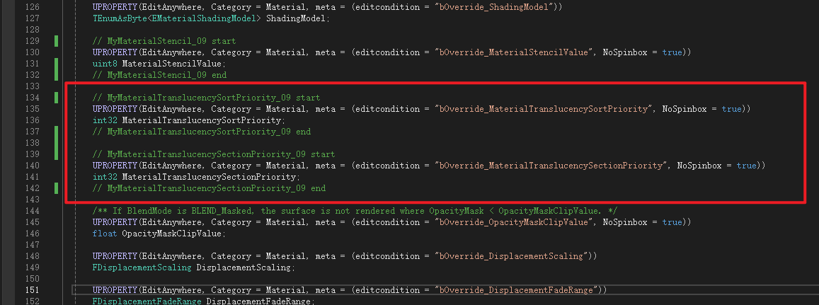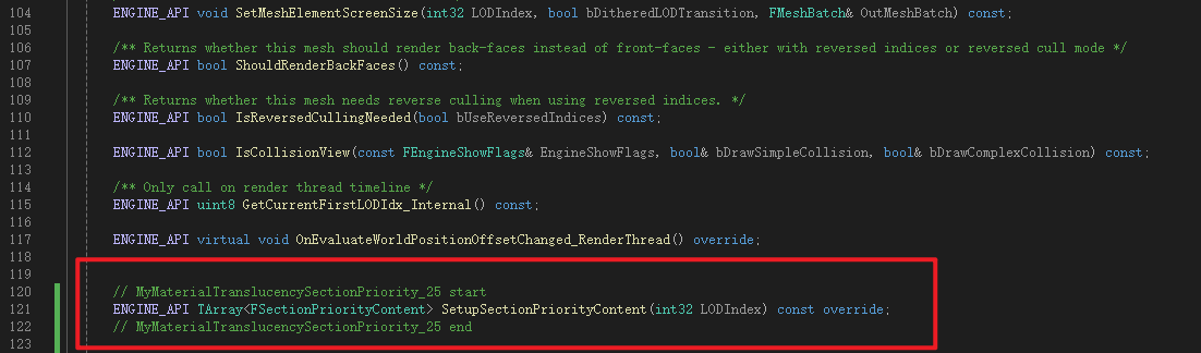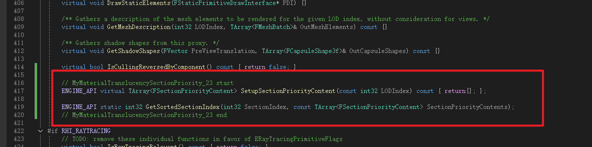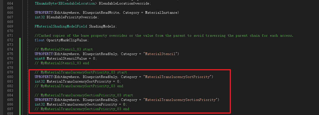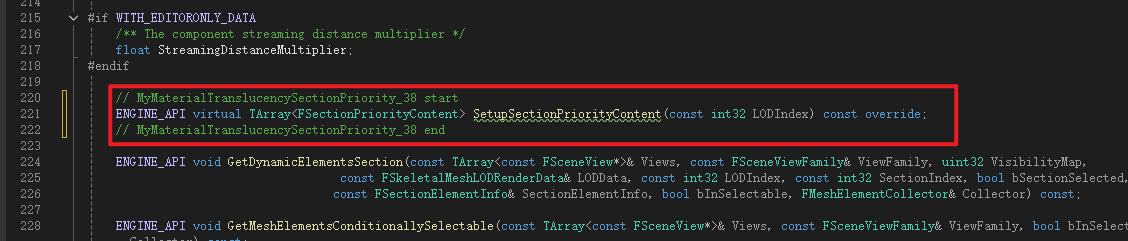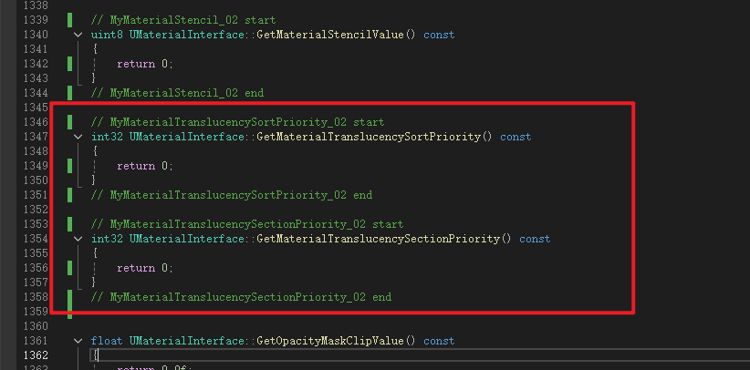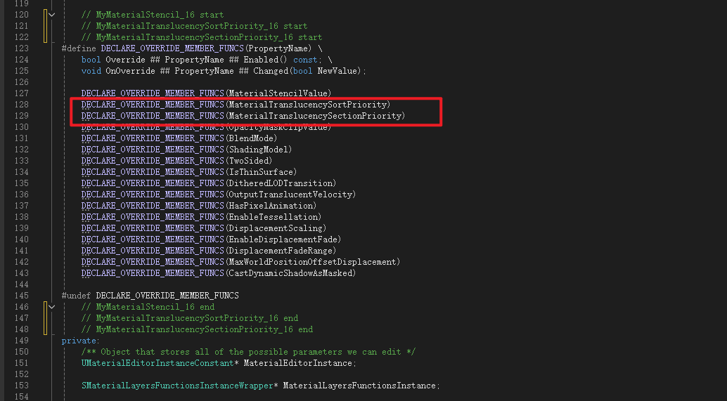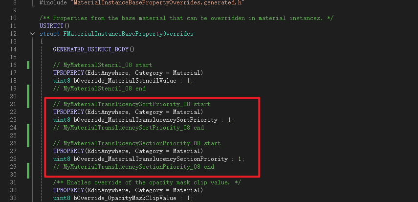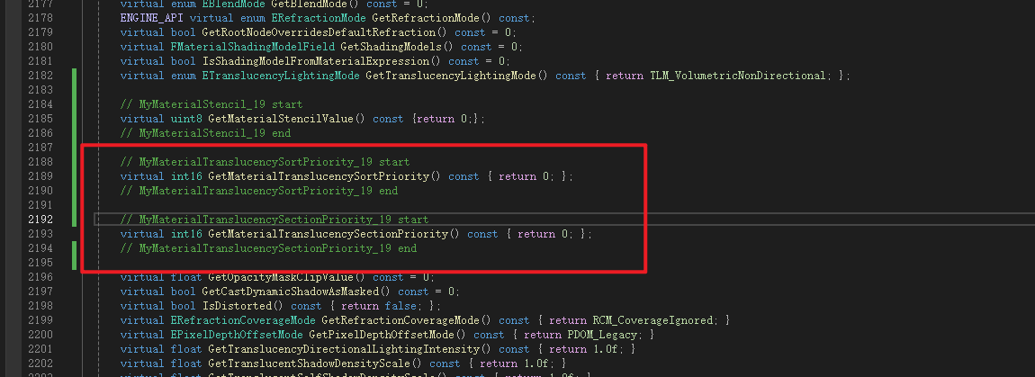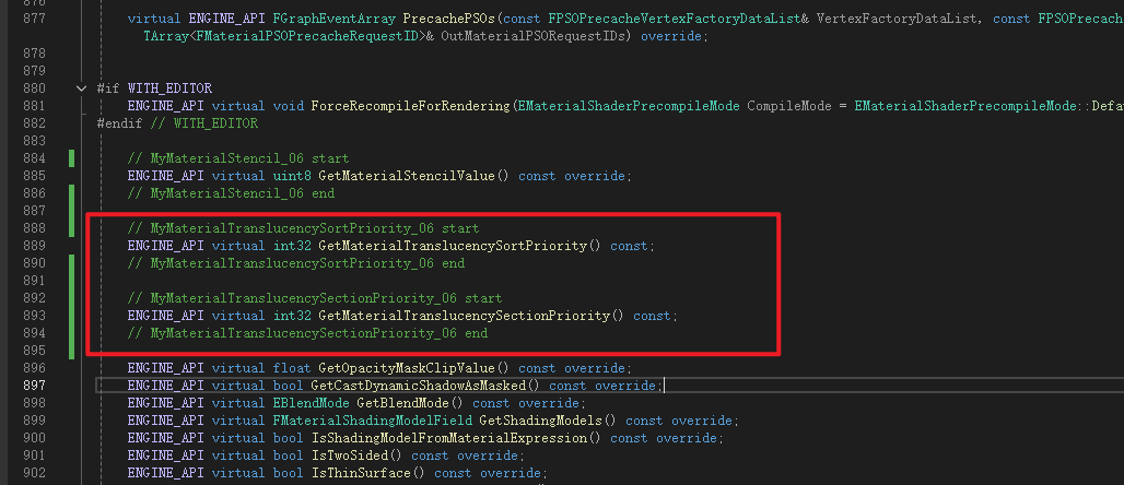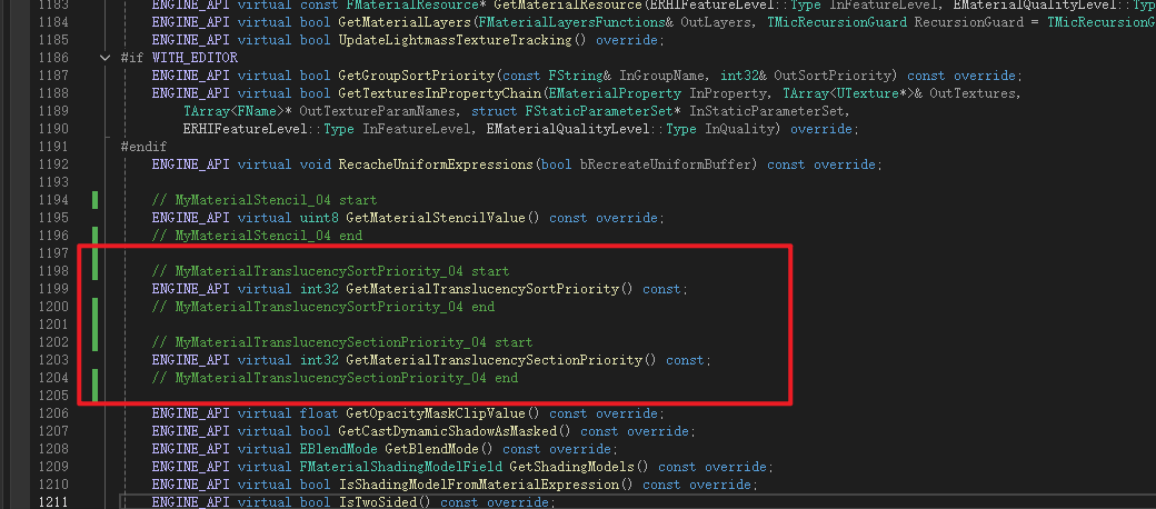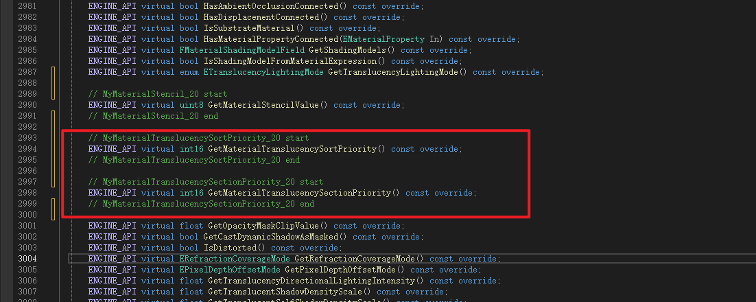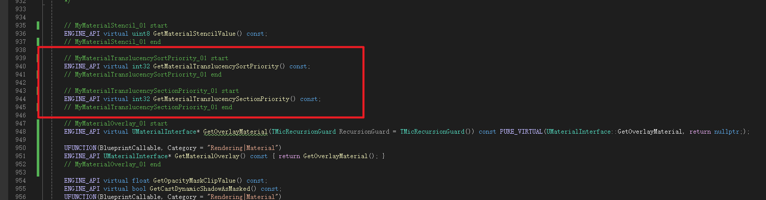 因为接口类应该保证轻量化,所以不应该存储大量变量数据,数据应该是在子类中存储,接口类设置Get方法就行,因为是虚函数,所以运行时会自动查找子类已经实现的方法进行调用。UMaterialInterface中添加MaterialTranslucencySortPriority和MaterialTranslucencySectionPriority成员变量的获取函数但不声明变量成员,前者负责控制整体排序,后者控制在多个材质在Mesh中的前后顺序 在下面声明获取函数,类型为int32