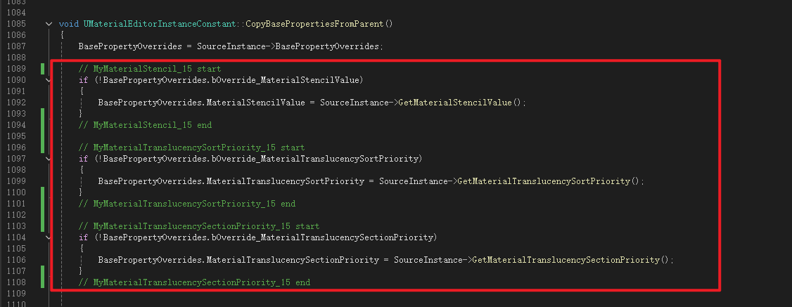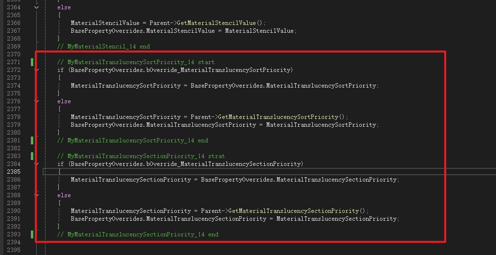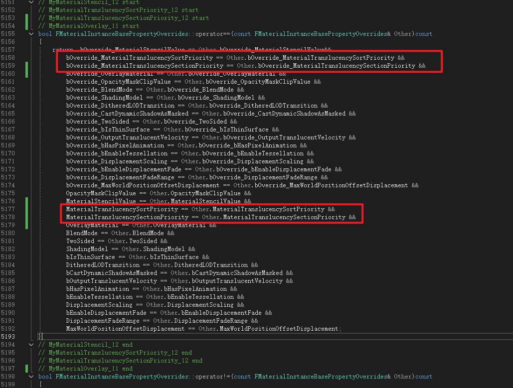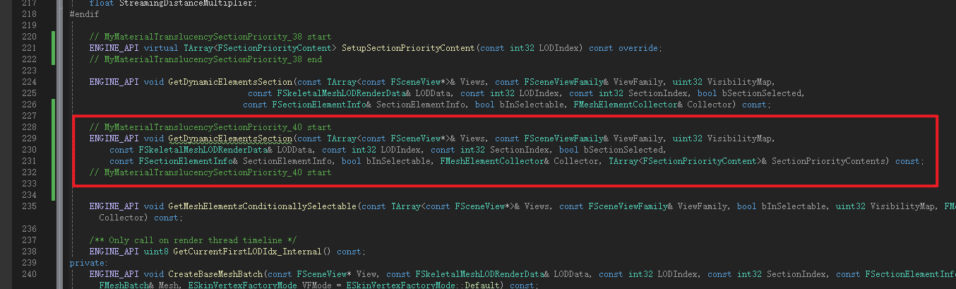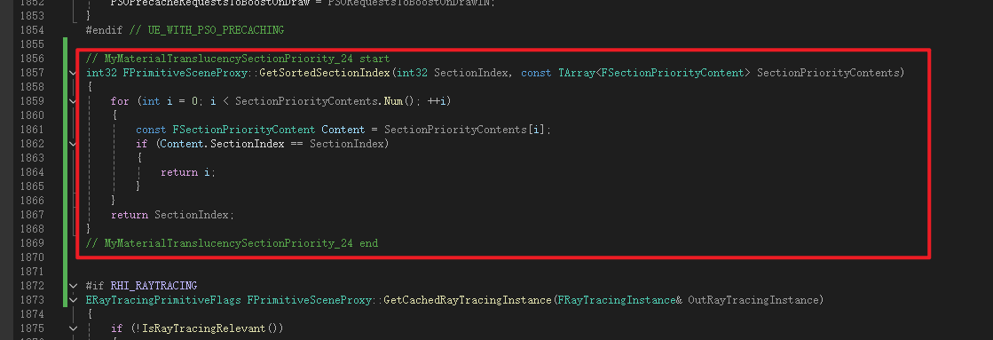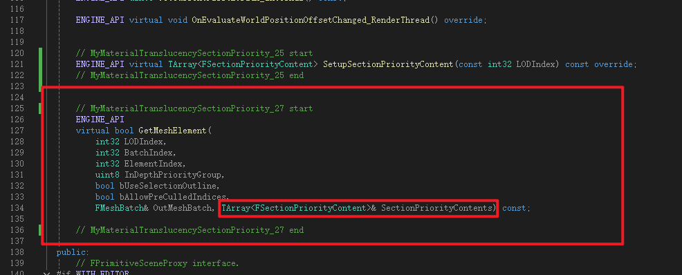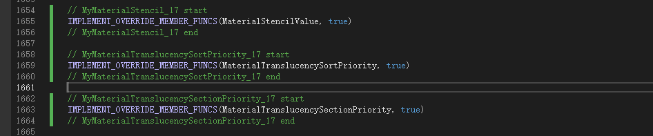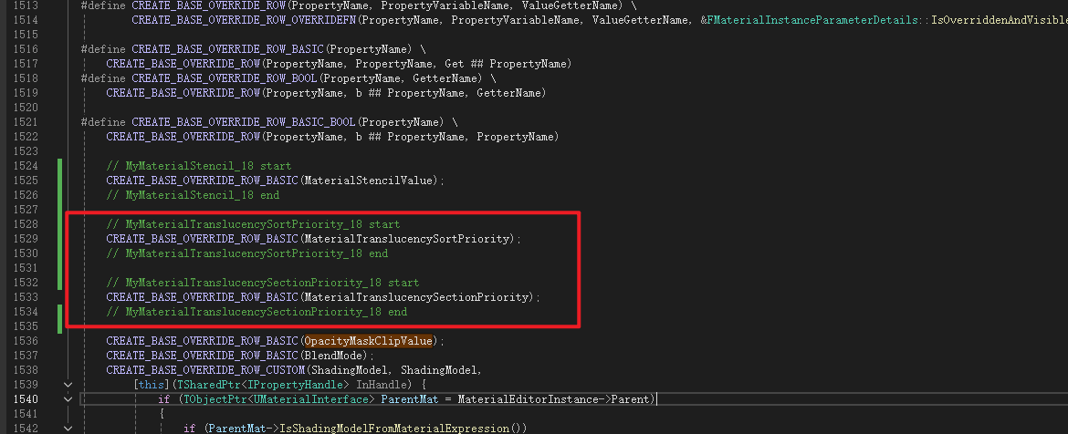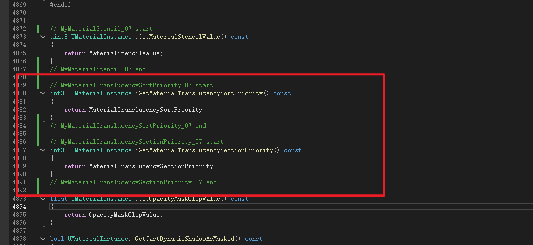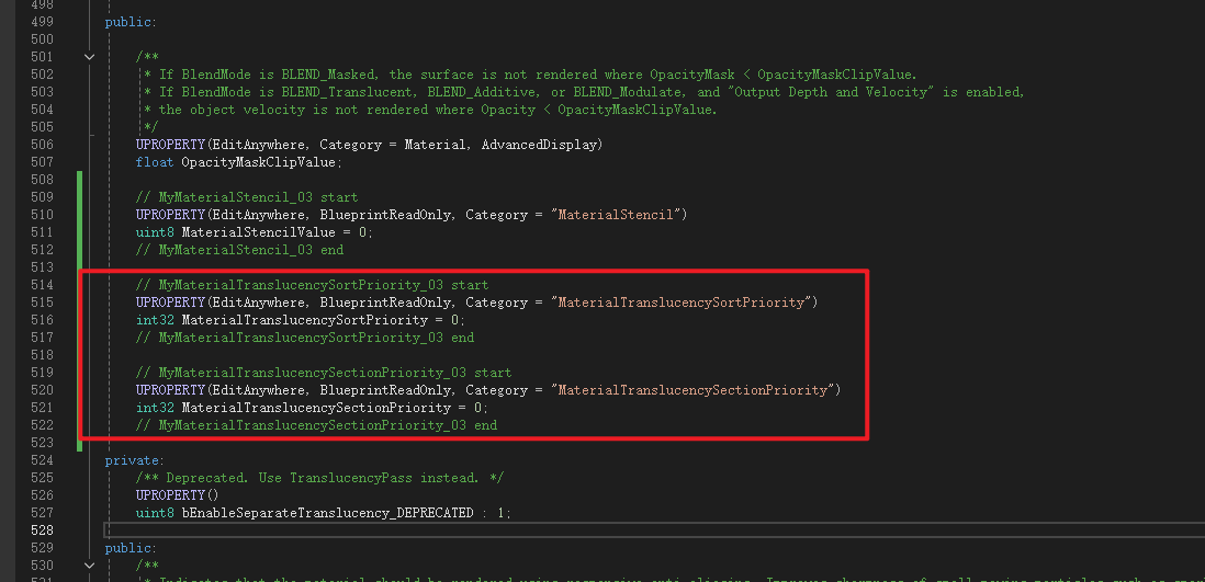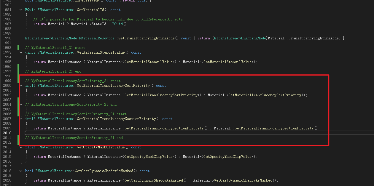 因为接口类应该保证轻量化,所以不应该存储大量变量数据,数据应该是在子类中存储,接口类设置Get方法就行,因为是虚函数,所以运行时会自动查找子类已经实现的方法进行调用。UMaterialInterface中添加MaterialTranslucencySortPriority和MaterialTranslucencySectionPriority成员变量的获取函数但不声明变量成员,前者负责控制整体排序,后者控制在多个材质在Mesh中的前后顺序 在下面声明获取函数,类型为int32