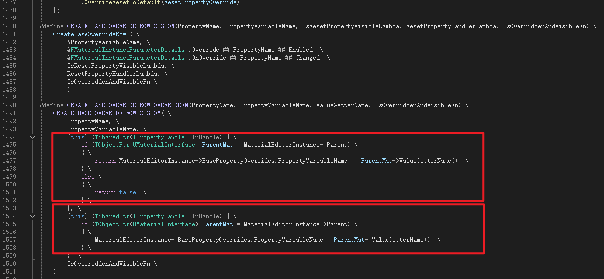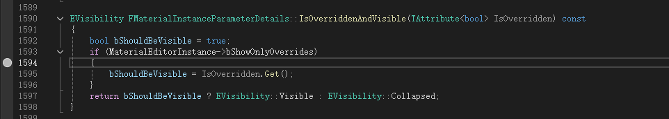 上面函数中的IsOverriddenAndVisibleFn对应是这里,默认是true,bShowOnlyOverrides它的值在MaterialEditorInstanceConstant.h中可以找到,但是这里的的是否显示我们并不能精准控制每一条属性的隐藏或显示,它是编辑器进行整体设定的