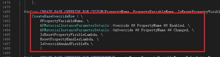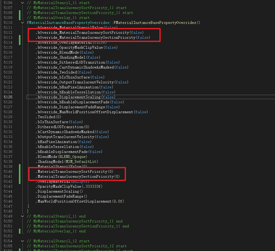 初始化结构体中的bool参数和属性默认值,这里需要注意顺序,之前MaterialInstanceBasePropertyOverrides中声明位置顺序需要与这里对应