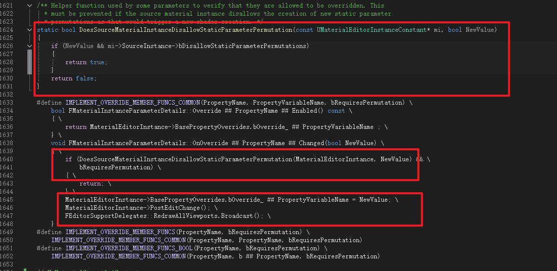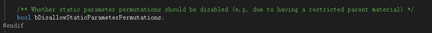 对于材质面板的参数判断其实分了层,感觉是真的繁琐,虽然我们是在面版上直接输入,但实际上UE将我们在面版上输入的值是存起来了也就是UMaterialInstanceConstant这个类型中,它继承UMaterialInstance,然后在与材质实例的参数值进行比对,最后在进行覆写操作。 上面图中的DoesSourceMaterialInstanceDisallowStaticParameterPermutation函数,它是判断复选框是否开启的时候材质是否为静态参数,NewValue是我们在面版上输入的值,它与默认值bDisallowStaticParameterPermutations组合进行判断,bDisallowStaticParameterPermutations如果为true,那么表示该材质为静态,不得修改,这个参数是在UMaterialInstance.h中,默认情况下是值为false