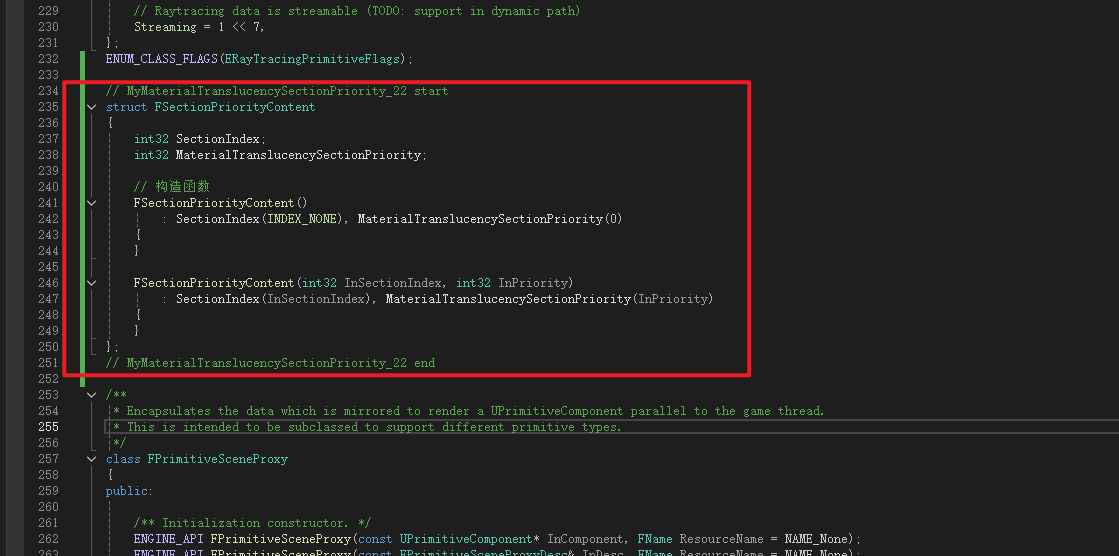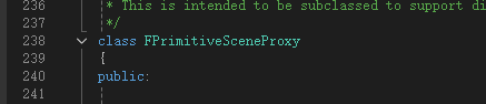 因为需要做排序,所以方便起见直接声明一个结构体来方便使用,当然直接声明在PrimitiveSceneProxy.h和SkeletalMeshSceneProxy.h中也可以,只不过需要声明两次。 找到这个类