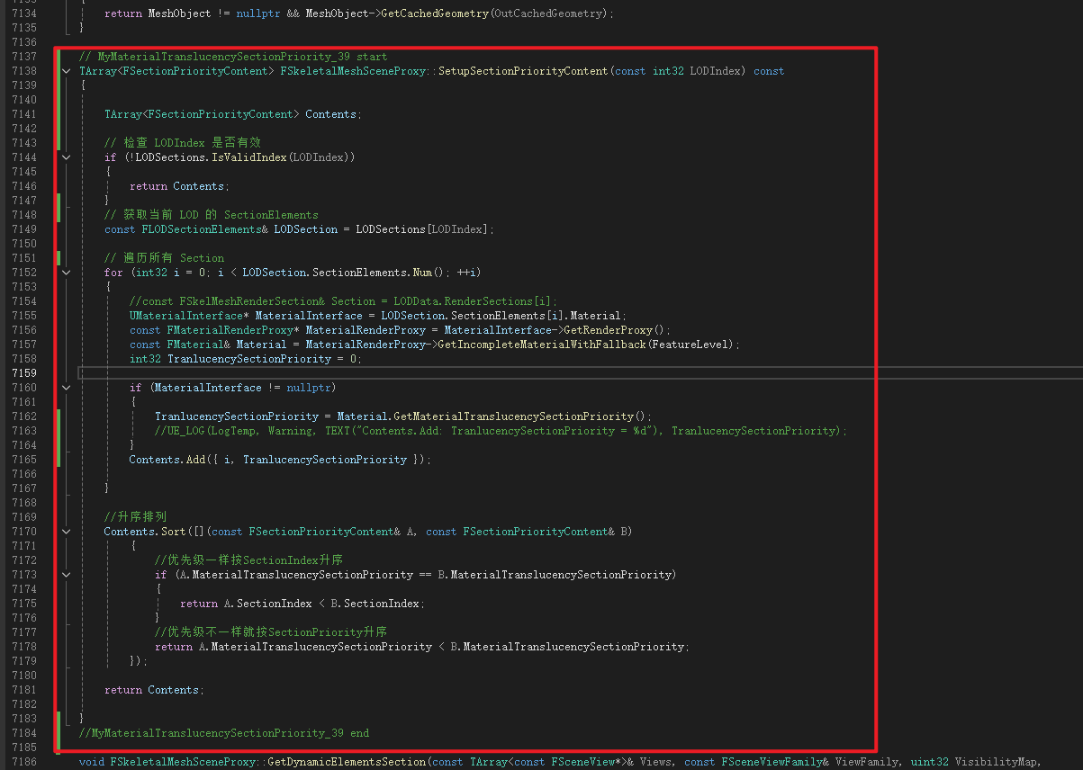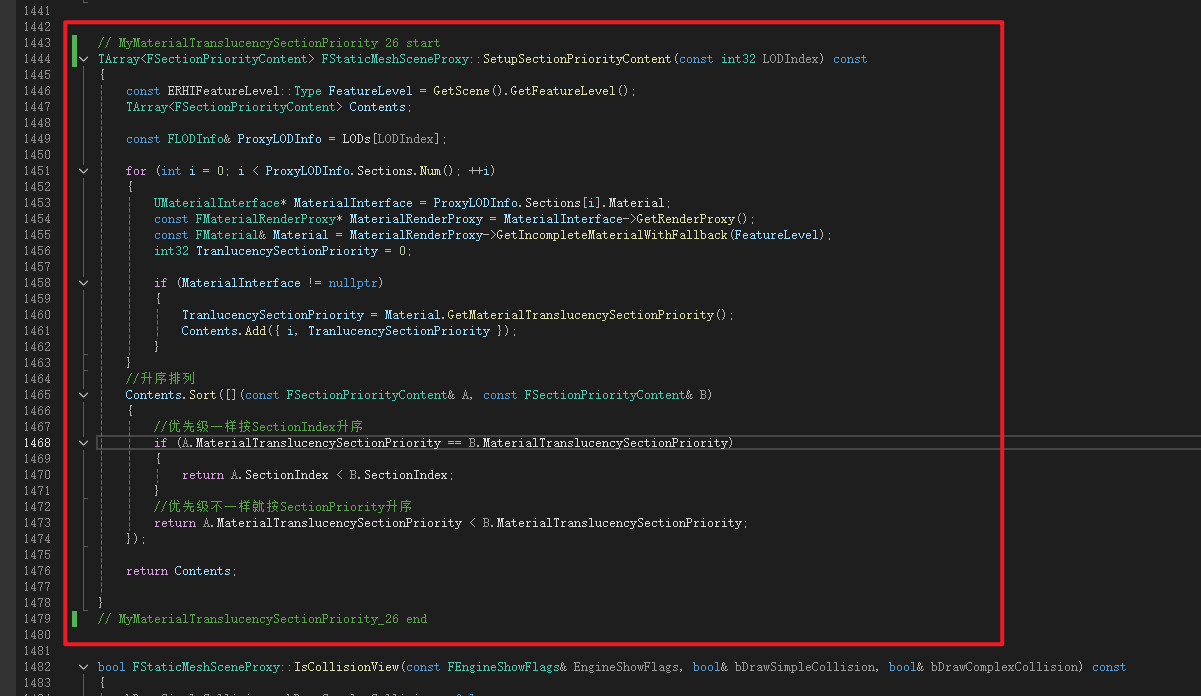 虽然名字不一样但是它是StaticMeshSceneProxy.h的cpp文件,这里对排序函数实现。,这里进行排序使用Lambda表达式结合自定义排序规则,MaterialTranslucencySectionPriority是设置在材质面板上的让它优先排序然后再根据默认的SectionIndex排序