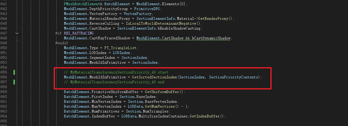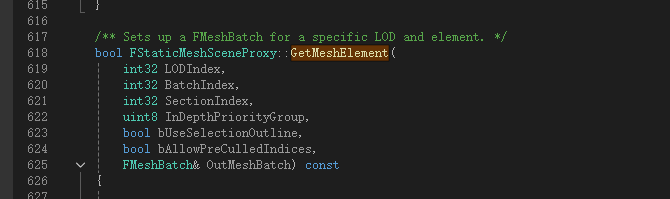 对于排序位置是根据MeshIdInPrimitive来设定的,现在已经有了进行索引排序处理,但是索引需要给到OutMeshBatch.MeshIdInPrimitive,MeshIdInPrimitive处理是在函数GetMeshElement中。GetDynamicMeshElements中调用了GetMeshElement函数