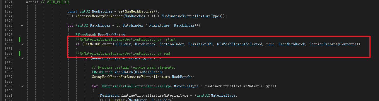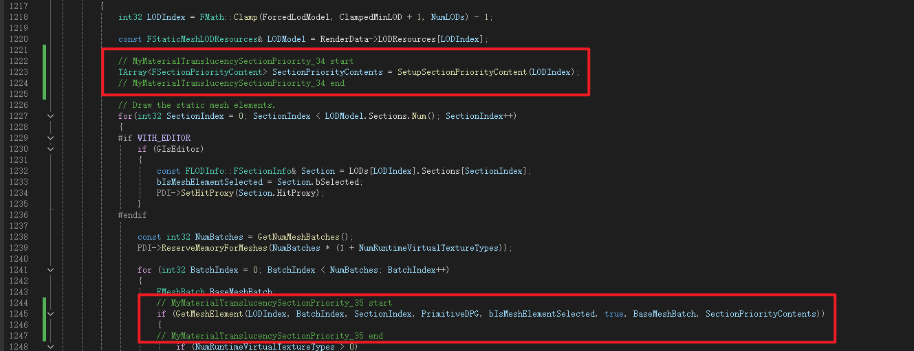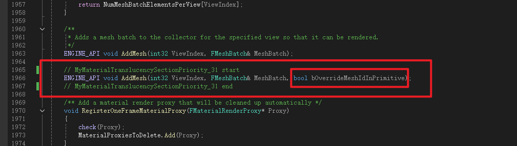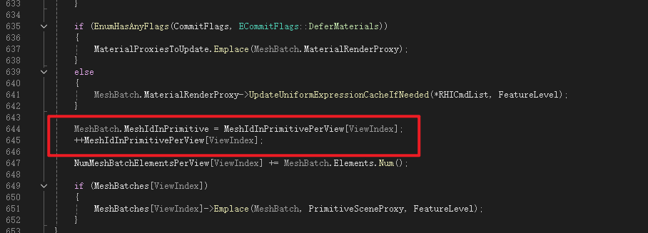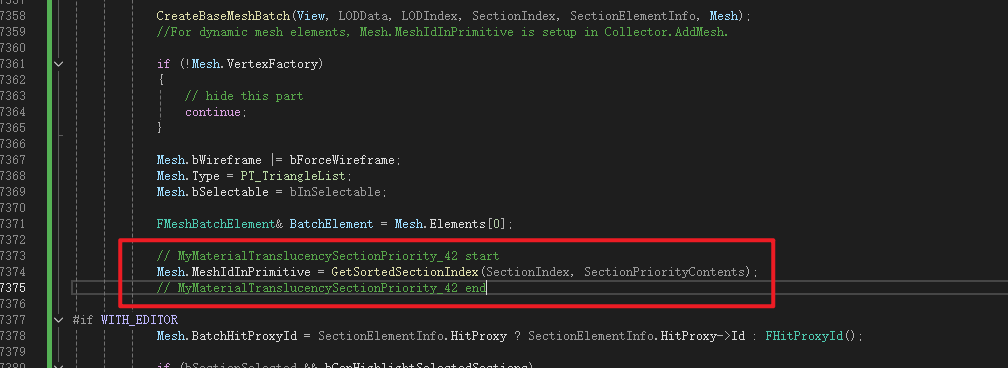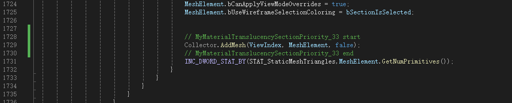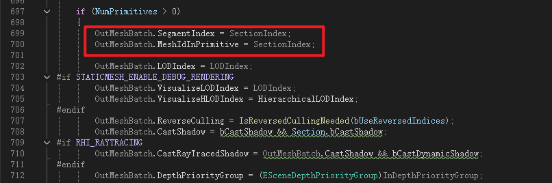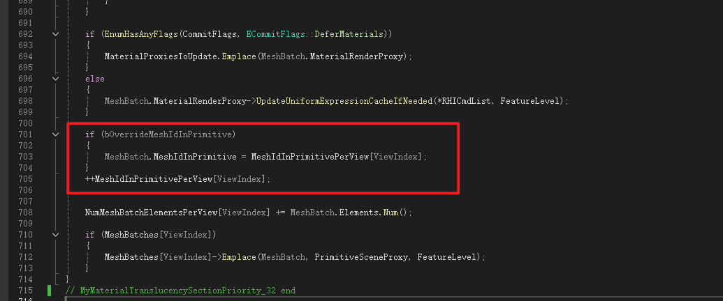 到这里GetDynamicMeshElements函数其实已经改完了,但是在函数末尾Collector.AddMesh会将我们设置的MeshIdInPrimitive给覆盖掉,所以需要做额外处理