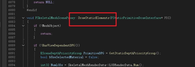 最后找到DrawStaticElements函数进行处理,如果不处理这部分,那么你在骨骼网格体资产预览是对的,但放在场景中却不生效