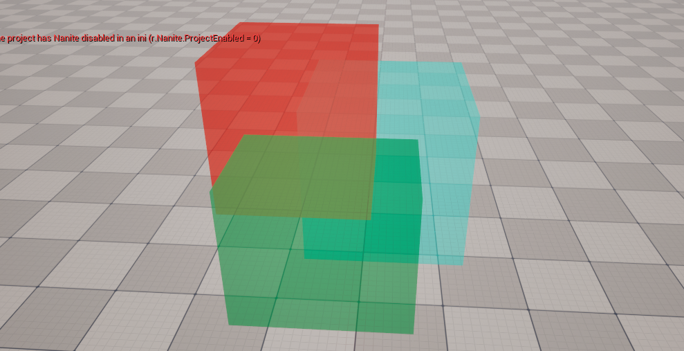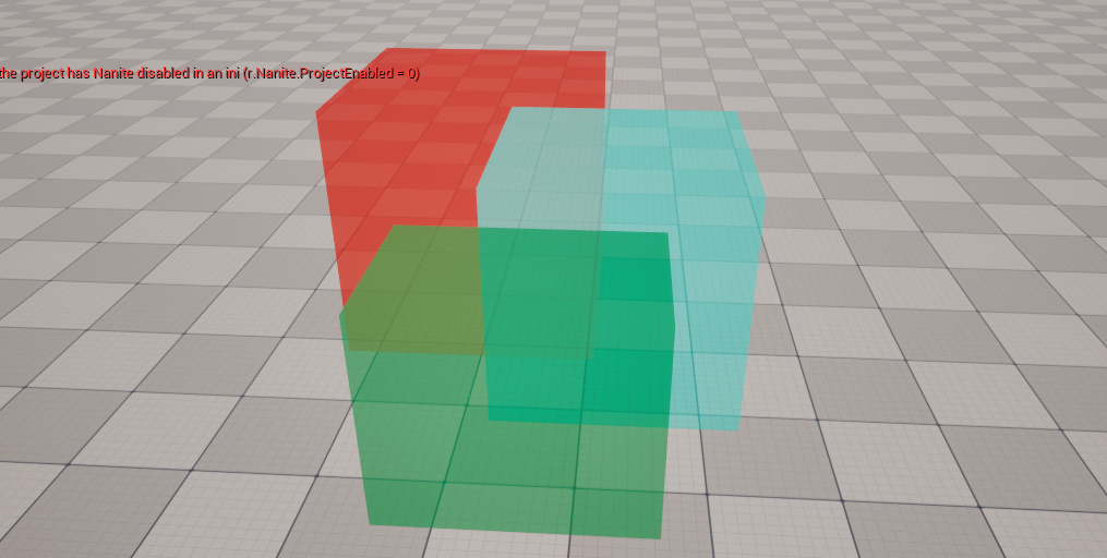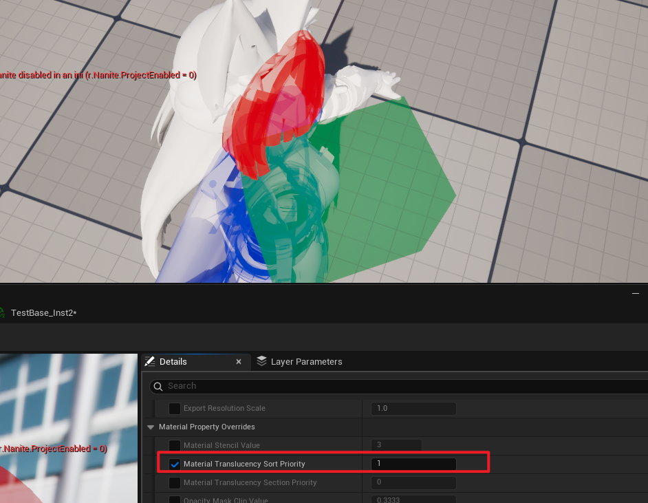 修改红色材质MaterialTranslucencySortPriority值为1,因为不受模型距离排序控制,所以红色会叠在最前方