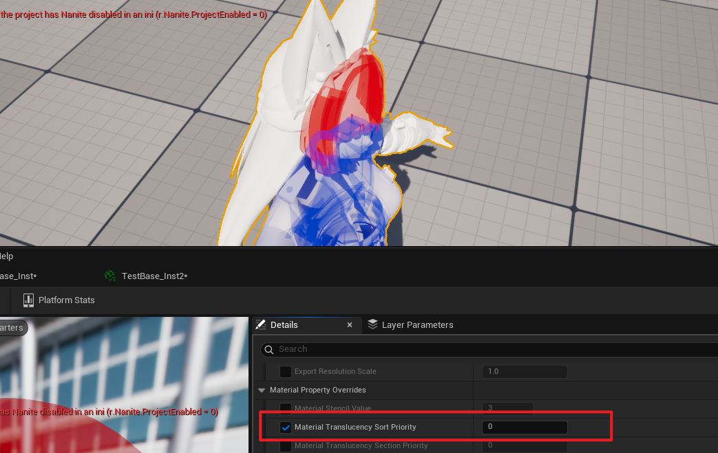修改红色材质MaterialTranslucencySortPriority值为1,排序更改生效