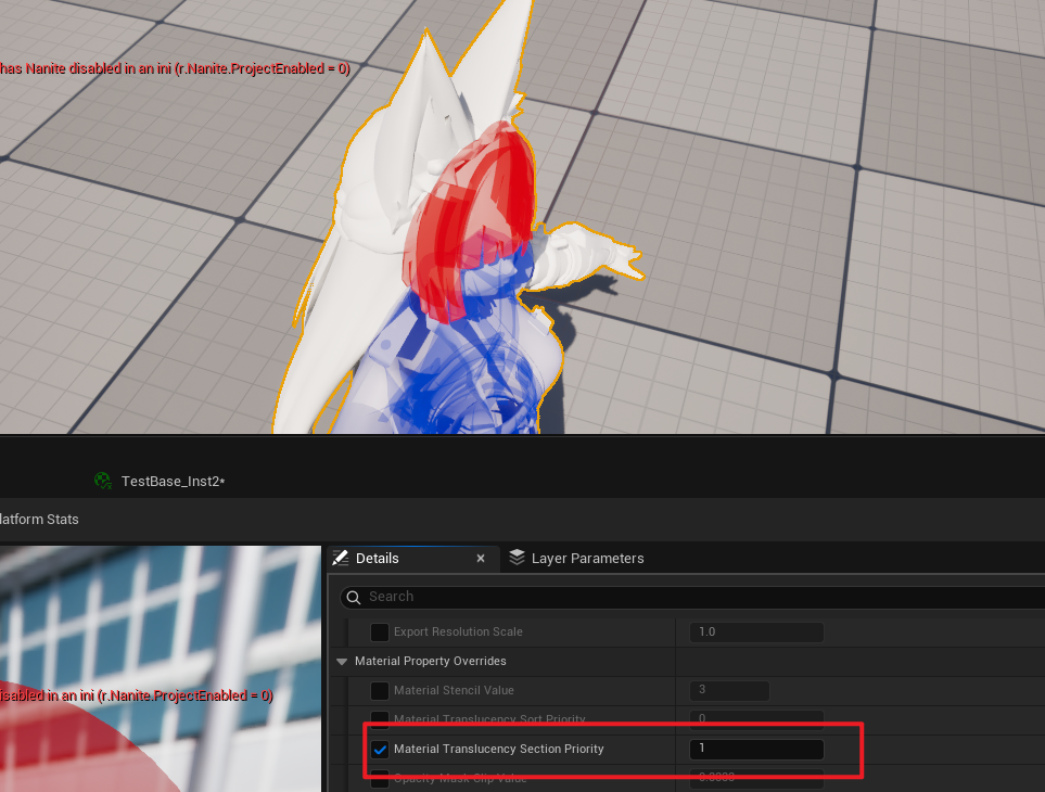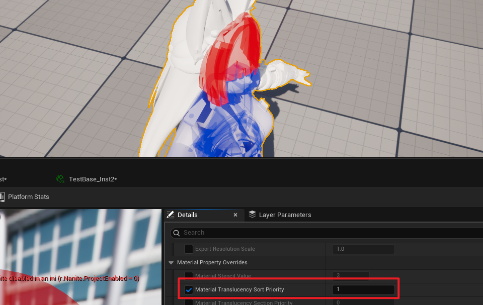 修改红色材质MaterialTranslucencySectionPriority值为1,红色会叠在蓝色前方,但不会超过其他模型