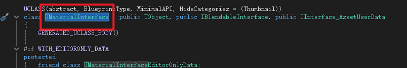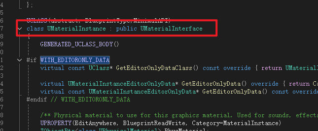 这里需要提一点,MaterialInstance并不是继承Material而是继承基类MaterialInterface,材质和材质实例是同级的 声明获取函数