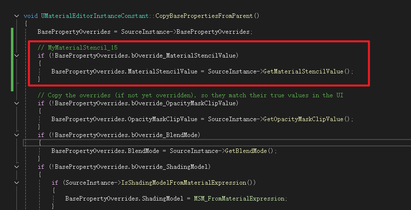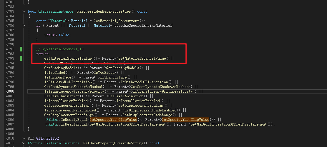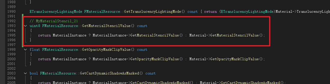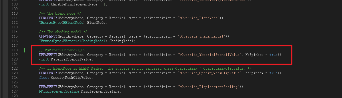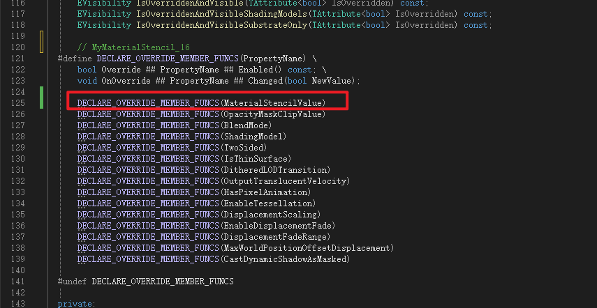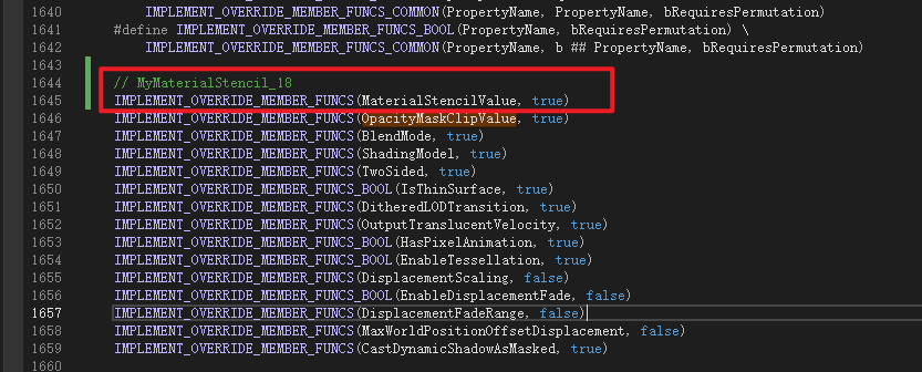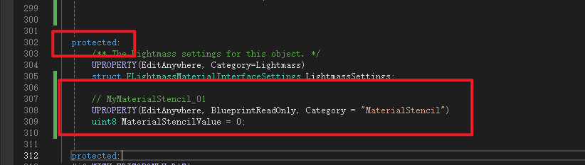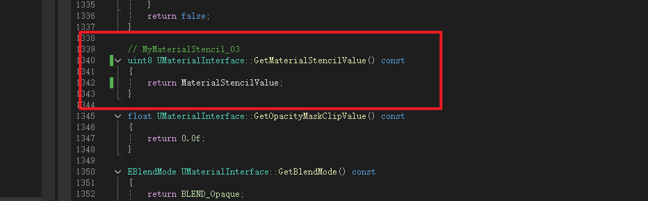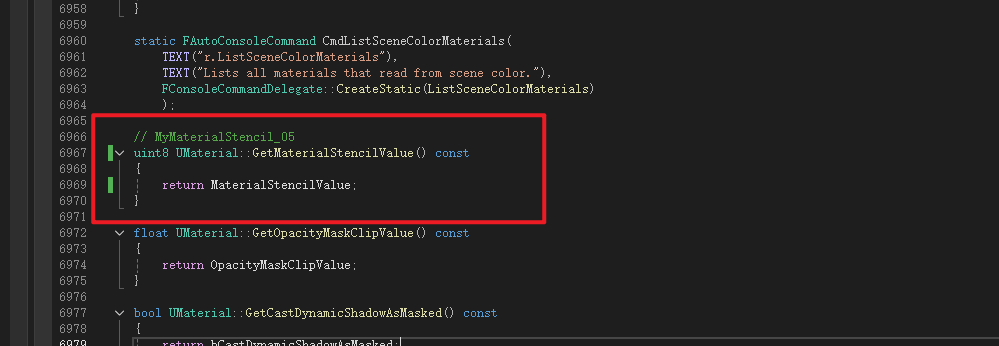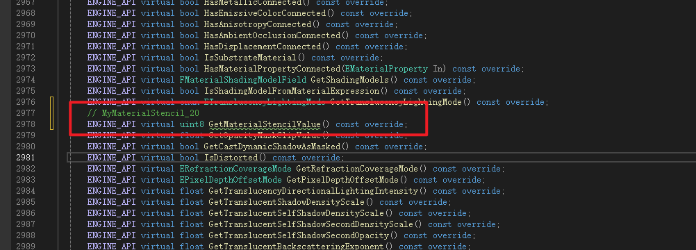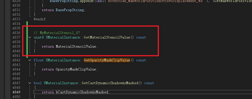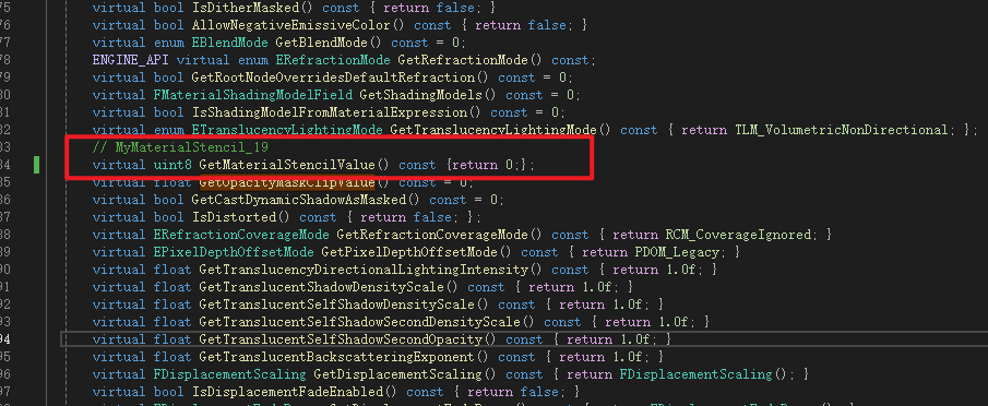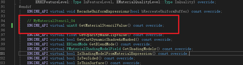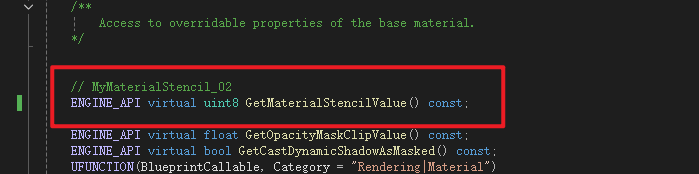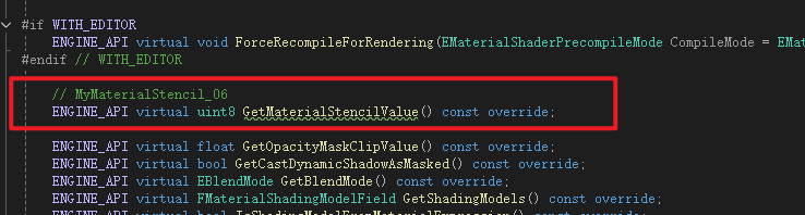 Material是MaterialInterface的子类,Material继承了MaterialInterface中声明的成员变量MaterialStencilValue所以不用再次声明,但是获取函数是虚函数所以需要重写,这里进行声明