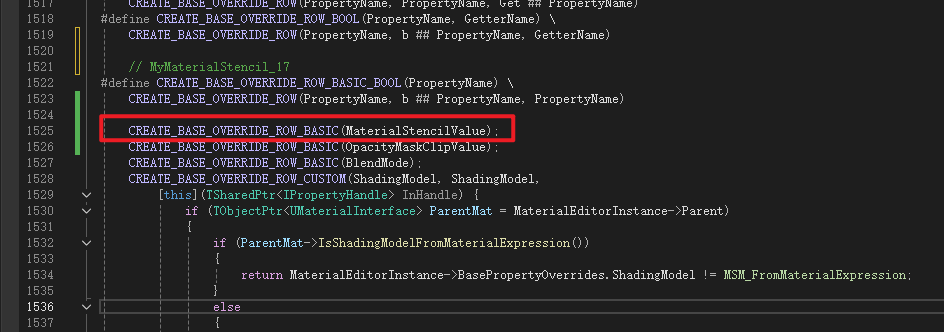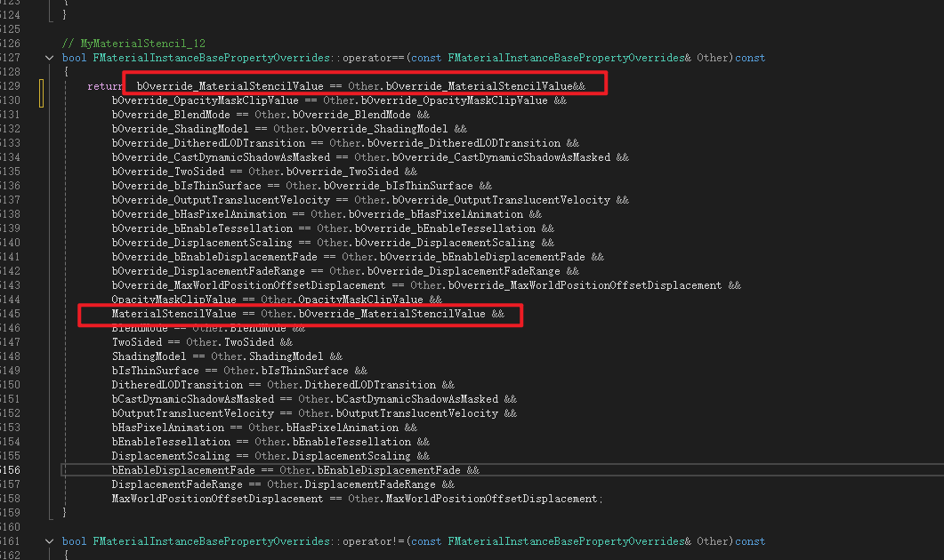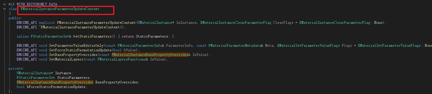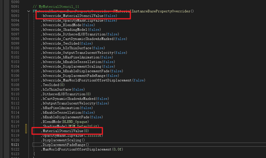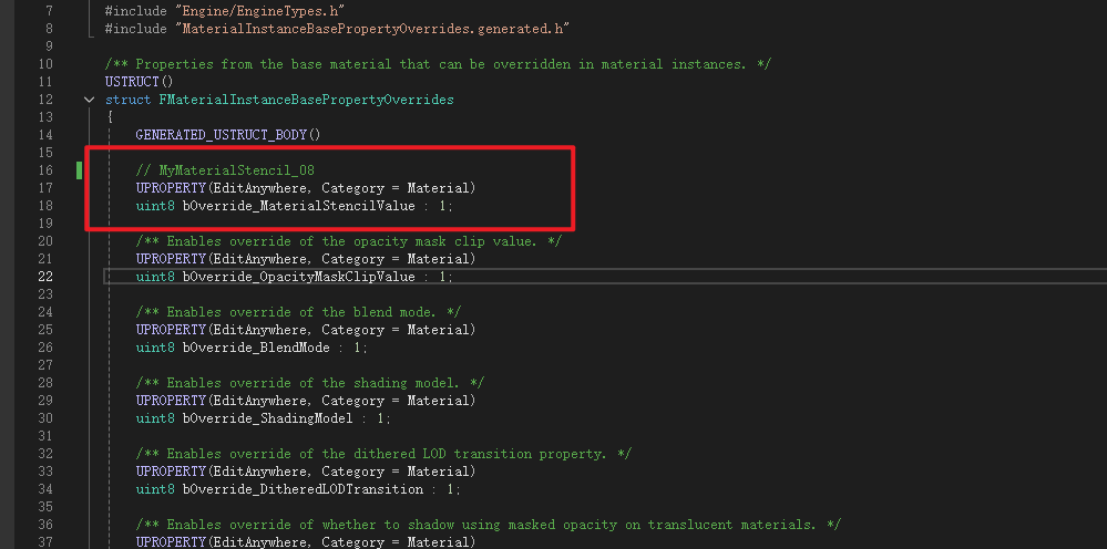 声明需要重写的值,是否重写的Bool,不太清楚为什么使用int类型不直接用Bool,可能还有其他用途或者防止内容溢出之类的 顺带一提这个文件是没有Cpp文件的,仅做声明变量使用,里面的变量实际上是做为材质和材质实例之间的成员比对类来使用,意思是比较材质和实例都包含这个类成员,所以直接比对材质和材质实例中这个类就行