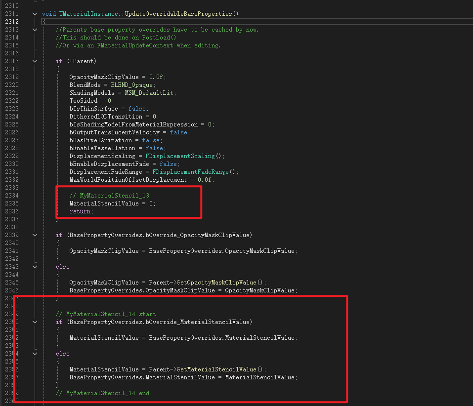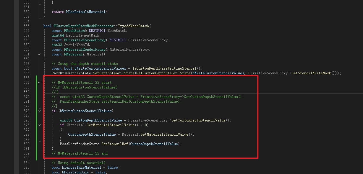 修改自定义深度渲染,因为自定义深度和自定义Stencil在UE中是绑定在一起的,默认就可以获取到CustomDepthStencilValue,所以只需要把我们创建的材质中的MaterialStencilValue传给它就行。有这里找到位置将注释地方更换掉,如果MaterialStencilValue大于0就直接输出给CustomDepthStencilValue