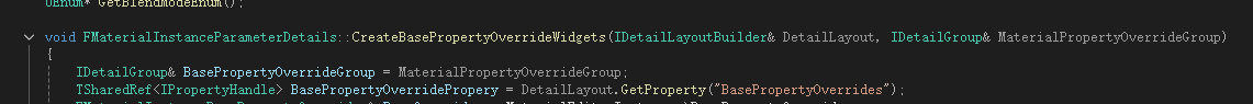 FMaterialInstanceBasePropertyOverrides这里是材质实例中的引用参数,MaterialInstance.h中可以看到材质参数更新就靠这里,传入参数是FMaterialInstanceBasePropertyOverrides。