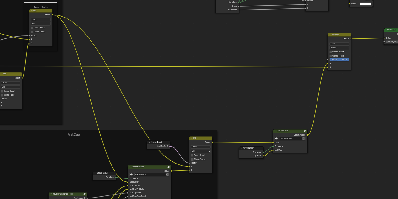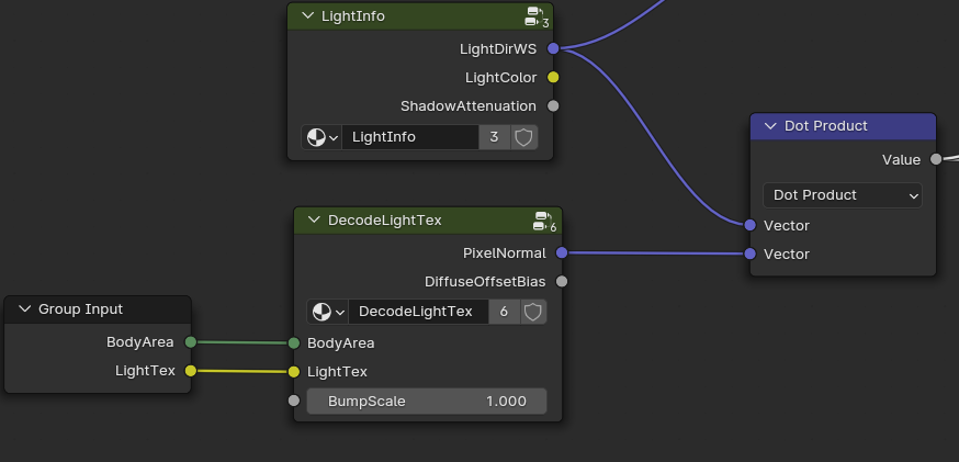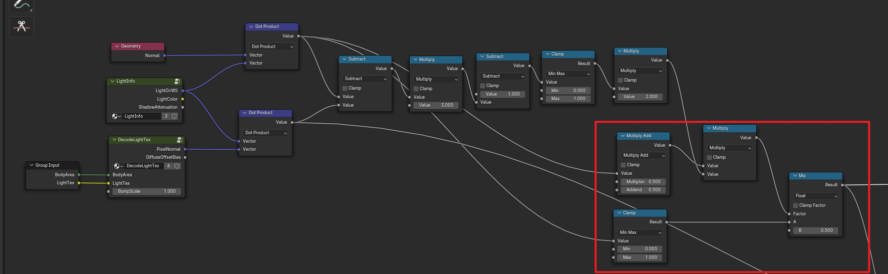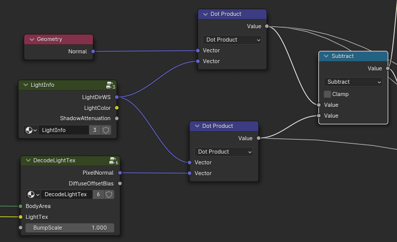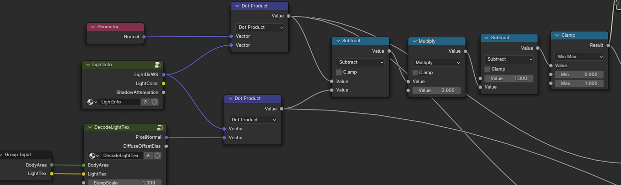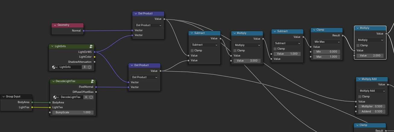 最后计算获得一个颜色衰减值,兰伯特的值是-1~1,这里使用半兰伯特0~1和遮罩系数进行计算是为了保留教暗地方的依旧有颜色衰减值,我们默认使用的是兰伯特光照,所以这里进行混合,使用0.5也就是均匀混合。这样就得到了一个颜色的衰减值,注意这里说的衰减值是作用于Gamma矫正也就是颜色变化,而不是仅仅亮度变化,这里叫做颜色Gamma矫正衰减系数应该比较合适