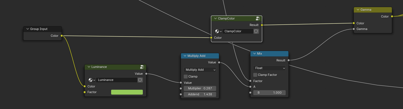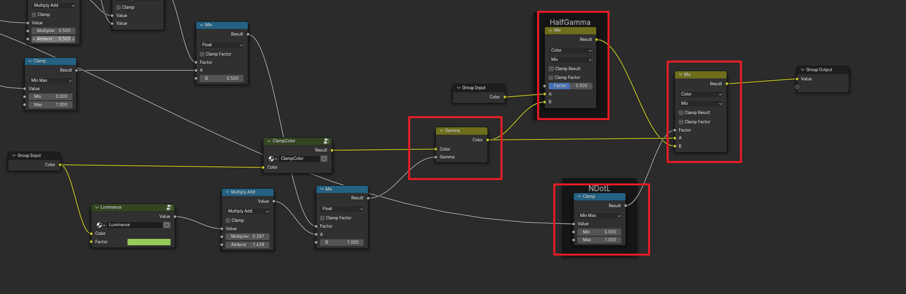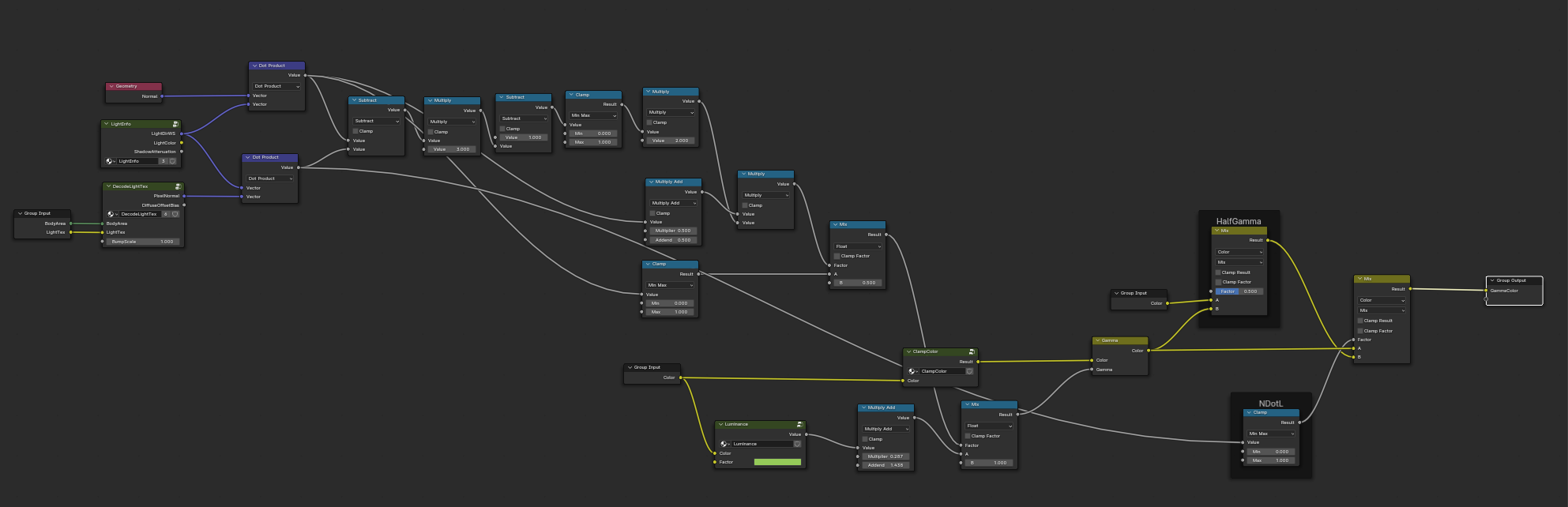 使用颜色Gamma矫正衰减系数混合计算Gmma值,这里这个乘 0.2875和加1.4375的操作也属于经验值,并不是固定的,以效果为准。有了Gama值后,现在就进行颜色的Gamma矫正了。Blender直接使用Gamma节点,根据效果来调整强度,使用兰伯特控制,亮的部分就使用Gamma,暗的地方就减小Gamma强度使用GammaHalf