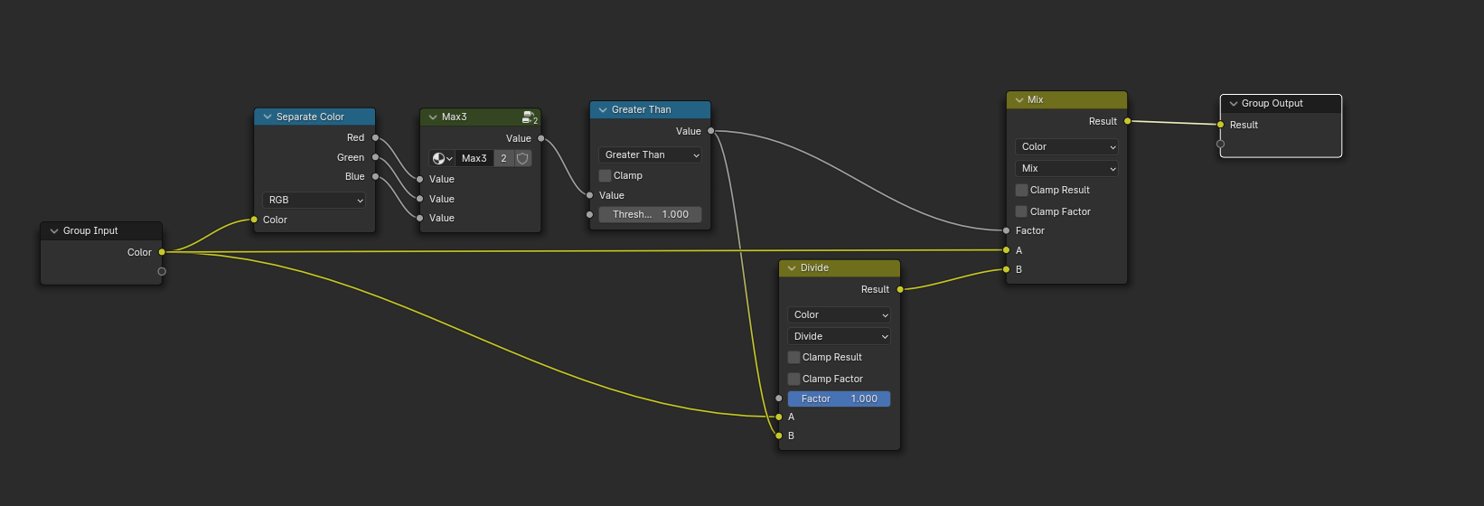 ClampColor组 这里对颜色各个分量取得最大值,如果大于1,就将整个颜色除以这个值进行压暗,保证颜色不变的情况下降低明度,钳制到1以下**