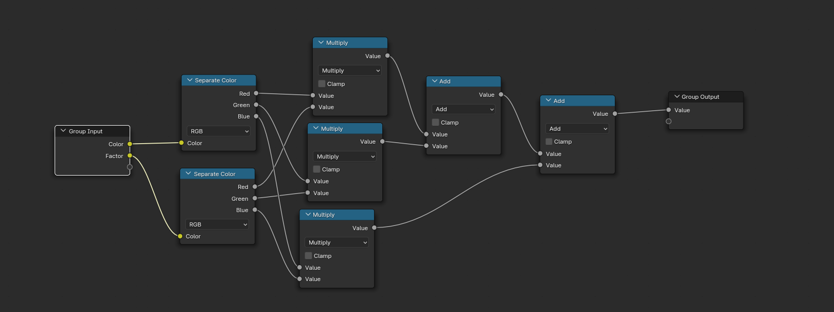 **Luminance组* 这里计算颜色的亮度值,因为Blender没有Luminance函数所以需要我们自己创建,参数有两个,一个是颜色,一个是各个通道的权重值,公式: 亮度值 = 0.299×R+0.587×G+0.114×B