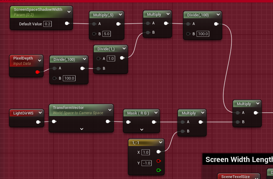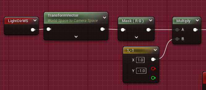 将灯光转换到相机空间,因为是屏幕投影,这里只取XY即可,因为UE屏幕采样的坐标是从左上角开始,那么Y垂直方向向下为正,当前是向下为负,所以这里Y分量需要乘上-1 最后灯光方向乘上偏移的程度就可以得到偏移量