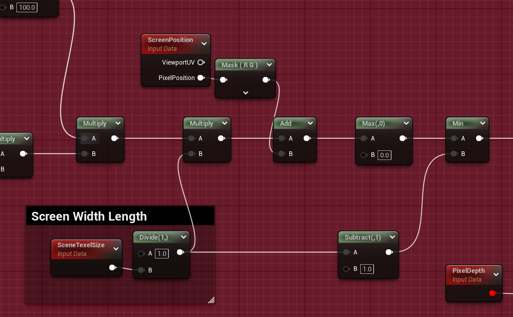 前面计算的偏移量,因为计算过透视除法,所以转到屏幕空间就需要乘上屏幕像素大小,也就是长宽。SceneTexelSize的值是1/ScreenWidth和1/ScreenLength,所以这里1/SceneTexelSize就可以得到长宽。原UV是像素位置的XY或者说是PositionCS.xy,偏移量与原UV相加这样就可以得到新的UV信息了,这里为了防止采样超过边界所以使用了max和min进行钳制