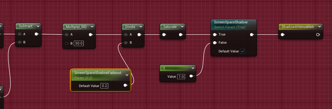 采样得到偏移后的深度后需要与原深度图进行相减,这样就可以获得投影部分了,除以100是为了将单位转换为m,新增ScreenSpaceShadowThreshold用于处理部分自阴影,可以理解为剔除掉距离近的部分阴影,比如鼻尖,面部 投影部分乘上50和除以一个ScreenSpaceShadowFadeOut进行控制阴影的衰减,然后防止过曝钳制到0~1,添加开关ScreenSpaceShadow控制是否开启