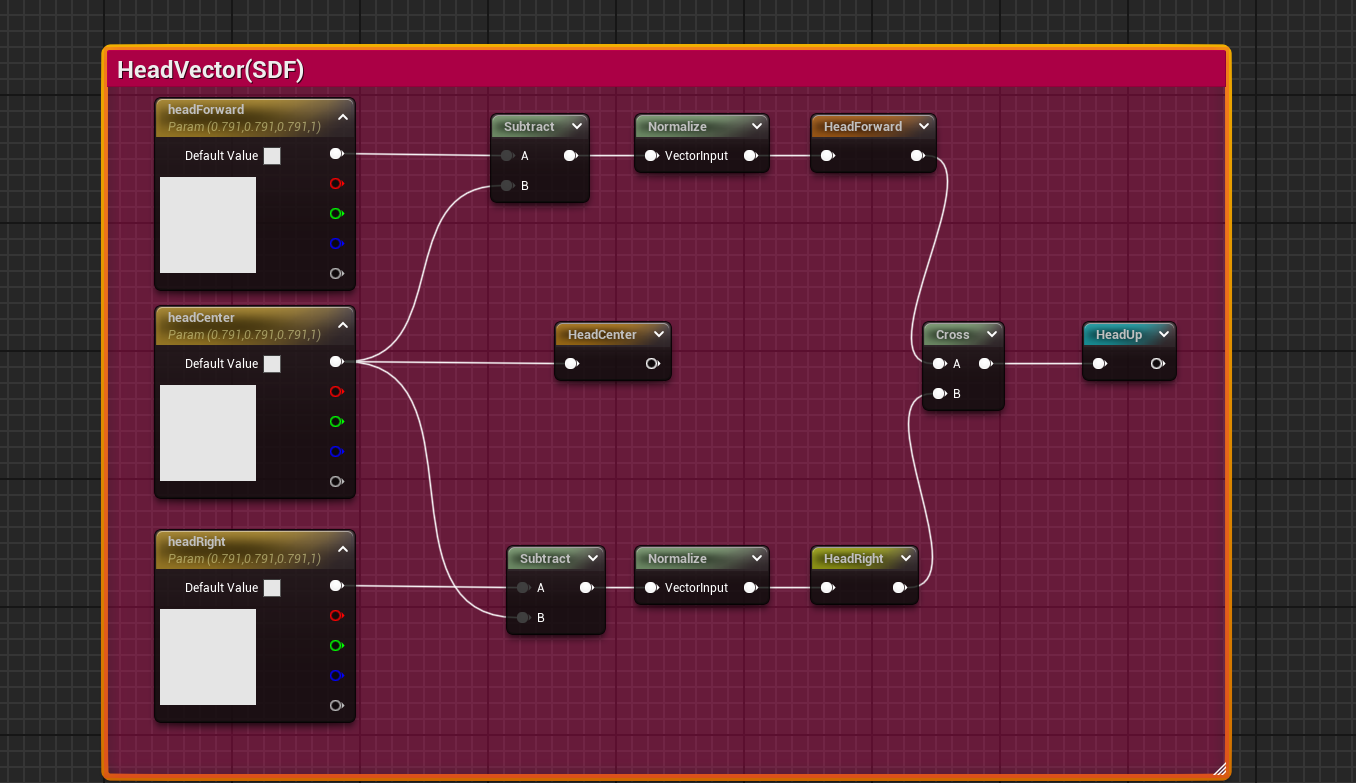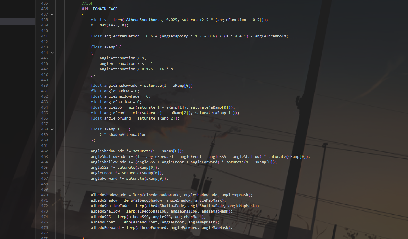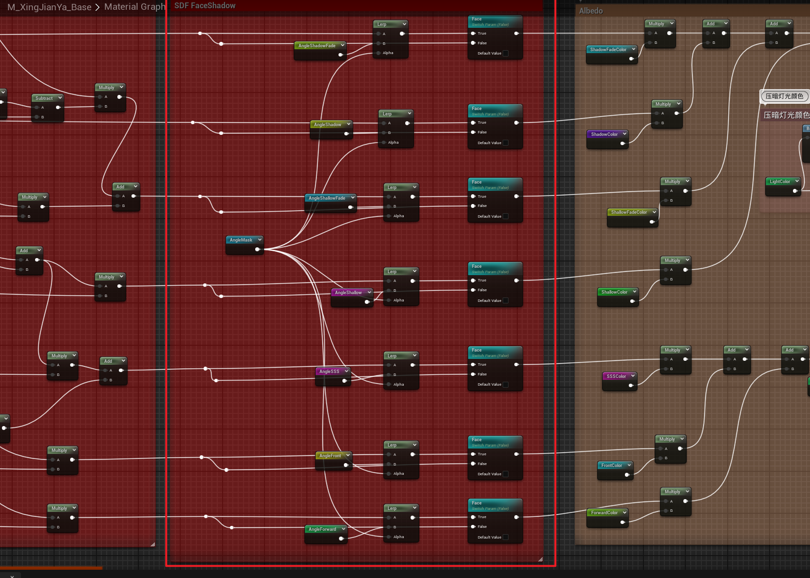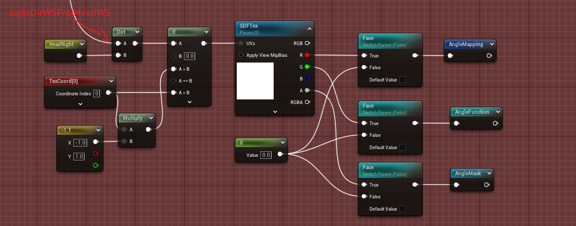 因为SDF图默认是左面受光,所以需要使用HeadRight与LightDirWSHeadWS点乘的正负判断光照在左还是在右,>0表示在右侧需要将UV的水平方向翻转进行采样,<0在左则不需要