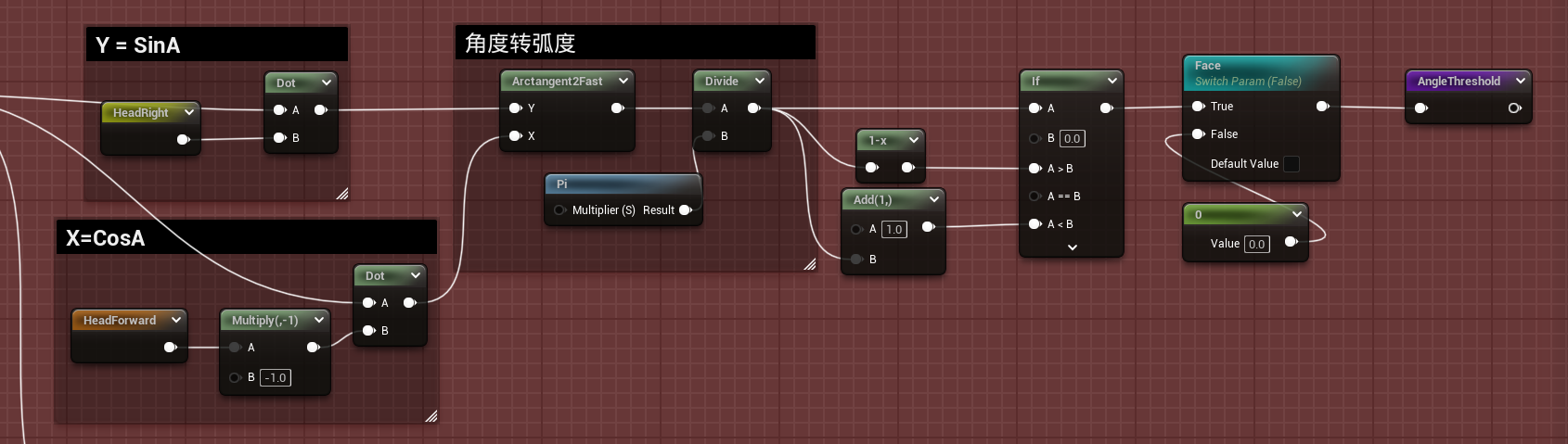 将光向量投影到HeadRight方向和-HeadForward方向对应就是水平2维坐标系的X,Y,为了获取光的方向与-HeadForward之间的夹角,通过反正切求出角度再转为弧度值,注意这里不是常规的反正切而是actan2函数,对应上图的话就是左右分两半,从-Forward方向为起点也就是0,向下为末端π,左半为正右半为负。所以函数的输出范围就是-π到π,那么转为弧度就-1到1。如果大于0就1-去这个值,小于零就加1,这样就得到当光线在正面时为0,在背面为1,得到AngelThreshold