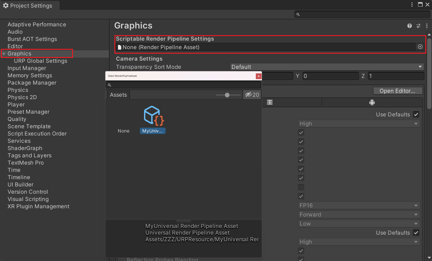 在ProjectSettings中找到Graphics进行渲染管线的指定,指定过后才能正确看到URP的材质