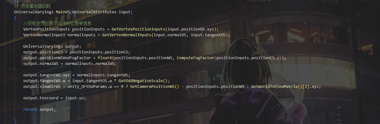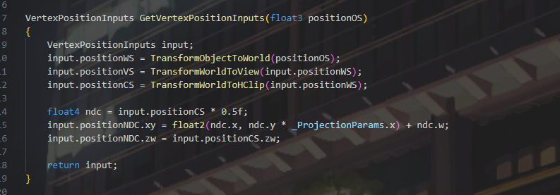 这里调用函数进行处理计算了多个空间下的数据后面直接调用就好 函数原型 ShaderLibrary/ShaderVariablesFunctions.hlsl