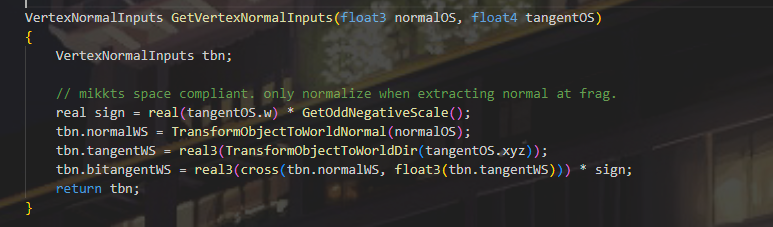 VertexNormalInputs normalInputs = GetVertexNormalInputs(input.normalOS, input.tangentOS);