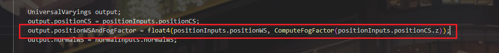 output.positionWSAndFogFactor = float4(positionInputs.positionWS, ComputeFogFactor(positionInputs.positionCS.z));