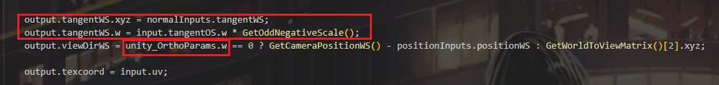 这里是世界空间下位置,和雾因子存储,位置仅占xyz三个通道,雾因子塞到w里面 切线需要进行特殊处理,处理法线或切线翻转情况 unity_OrthoParams.w是判断相机是否是透视和正交,如果是正交则需要特殊处理