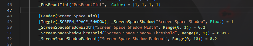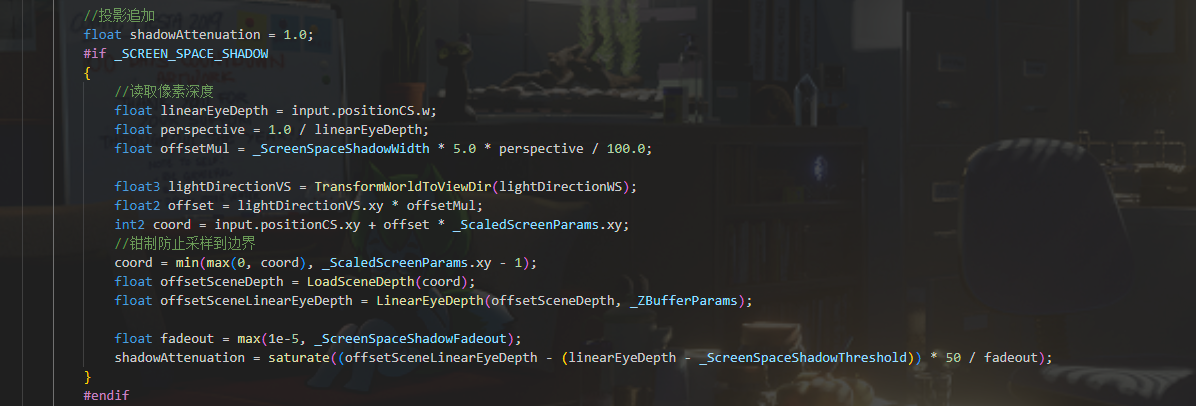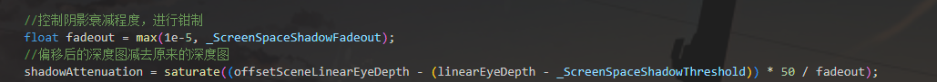 shadowAttenuation = saturate((offsetSceneLinearEyeDepth - (linearEyeDepth - _ScreenSpaceShadowThreshold)) * 50 / fadeout);