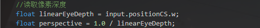 对于深度信息,实际上就是裁剪空间下的w分量,它已经是线性的了。如果要关联屏幕像素,就需要将屏幕空间宽度系数转换到深度空间,也就是进行透视除法,也就是需要除以W分量 这里先取得了W分量,然后计算了透视除法的因子,也就是1.0/linearEyeDepth