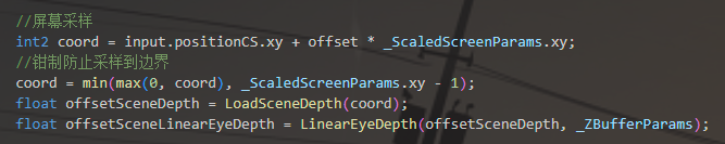 计算屏幕UV采样坐标,原坐标就是裁剪空间的XY,Offset是NDC下的所以需要乘上屏幕的长宽,然后对坐标进行限制防止越界。然后就是采样,采样出来的是非线性的所以需要进行转换,最后就是进行线性转换
