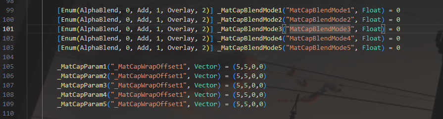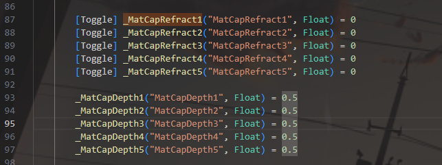 MatCap宏开关和贴图 MatCap的基础混色,混合颜色强度强度,混合Alpha程度 反射开关,这里没有设置宏,仅为开关,在后面声明之后当Float(Bool)用就行。还有深度值,用于计算折射 混合模式设置,UV偏移 声明