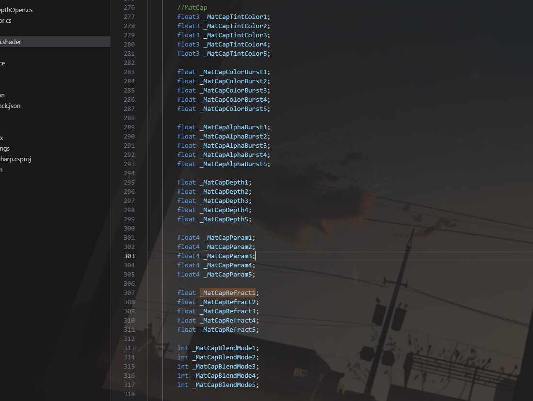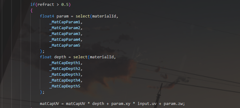 这里并非是真的计算折射,其实只是对MatCap采样进行缩放和平移调整。 获取各个区域不同的UV和Depth参数进行混合,调整matCapUV param.xy * input.uv是表示物体UV方向的偏移(为了保证效果贴合物体本身UV),但为了整体控制偏移也使用了+ param.zw