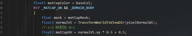 采样matCap的固定公式,将法线转换到观察空间,取XY作为UV进行采样,这里因为原本法线是-1~1,这里需要重映射到0~1