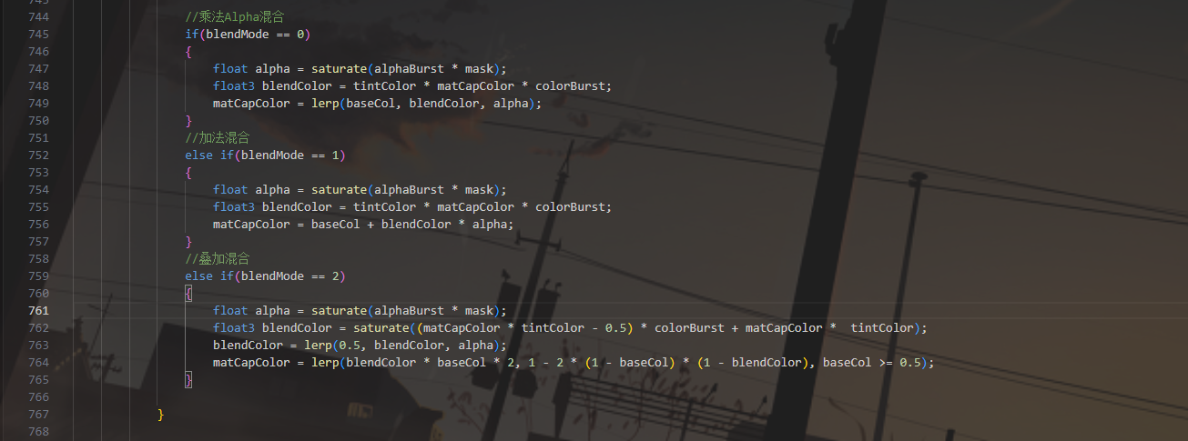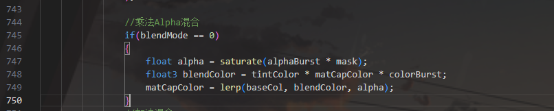 这里是三种混合方式 乘法混合(Multiply Alpha Blend) 这里先计算Alpha的值,blendColor就是MatCap采样颜色乘上基础混合颜色和Matcap颜色总强度,最后是使用alpha进行插值 从效果来说,乘法会使颜色变暗,而使用alpha混合,输出部分就全部是Matcap颜色或全是基础颜色,两者是不会有重叠的