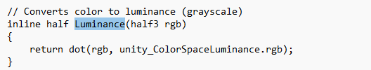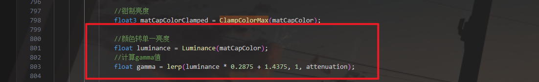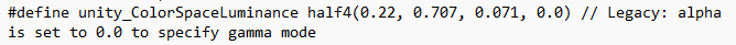 Luminance()函数在UnityCG.cginc中 Unity的颜色权重宏定义 Luminance()函数原型 默认的SRGB权重 现在有了Gama值后,现在就进行颜色的Gamma矫正了。直接使用pow即可,钳制一下不要等于0了,根据效果来调整强度,使用兰伯特控制,亮的部分就使用Gamma,暗的地方就减小Gamma强使用GammaHalf 完整代码