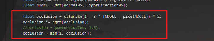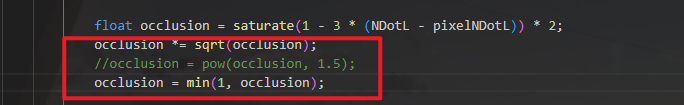 1 -  (NDotL - pixelNDotL) 当前遮蔽信息还是不够强烈所以先乘上3在用1减去,这样增强效果,这里乘以几都可以,可以随意调整,以效果为主,最后进行钳制防止有小于零的值 saturate((1 - 3 * (NDotL - pixelNDotL))) occlusion的杂色太多了,所以整体提亮2倍,去除一些杂色,只保留较小的信息,这里乘几同样也是经验值类的,自己随意调整以效果为准 (saturate((1 - 3 * (NDotL - pixelNDotL))) * 2 这里进行了occlusion乘上他的平方根,这样写不太好理解作用,它等价于pow(occlusion,1.5)。那么pow的作用就增加对比度,亮度更亮暗的更暗,最后在钳制防止超过1 最后计算获得一个颜色衰减值,兰伯特的值是-1~1,这里使用半兰伯特0~1和遮罩系数进行计算是为了保留教暗地方的依旧有颜色衰减值,我们默认使用的是兰伯特光照,所以这里进行混合,使用0.5也就是均匀混合。这样就得到了一个颜色的衰减值,注意这里说的衰减值是作用于Gamma矫正也就是颜色变化,而不是仅仅亮度变化,这里叫做颜色Gamma矫正衰减系数应该比较合适