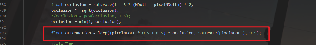 float attenuation = lerp((pixelNDotL * 0.5 + 0.5) * occlusion, saturate(pixelNDotL), 0.5);